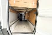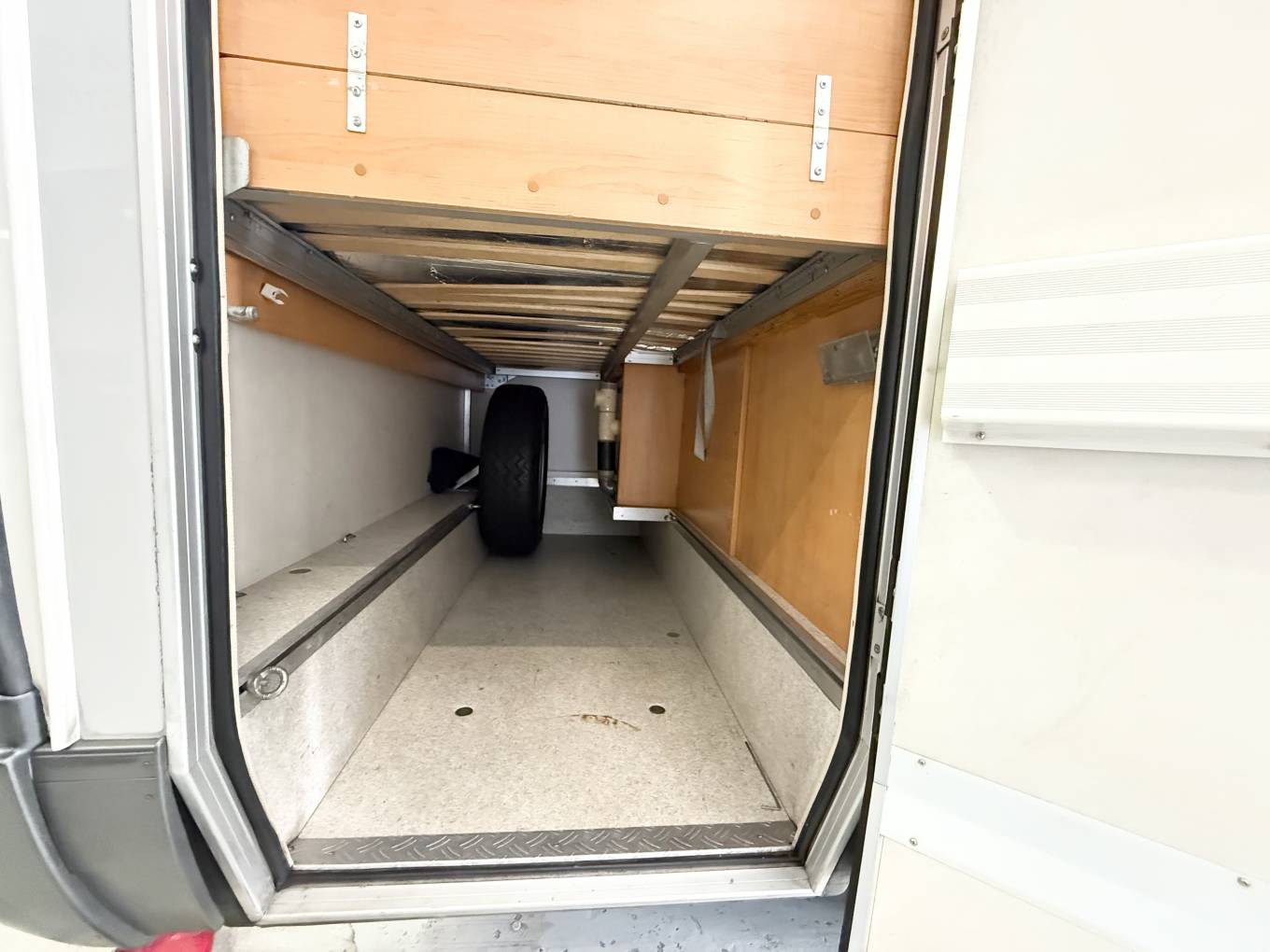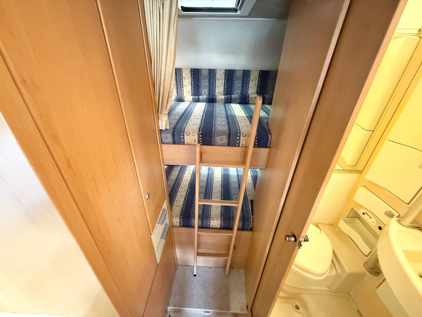 At the rear you have 2 good sized transverse bunk beds, the bottom of which can be lifted to make a very large garage with large external door.