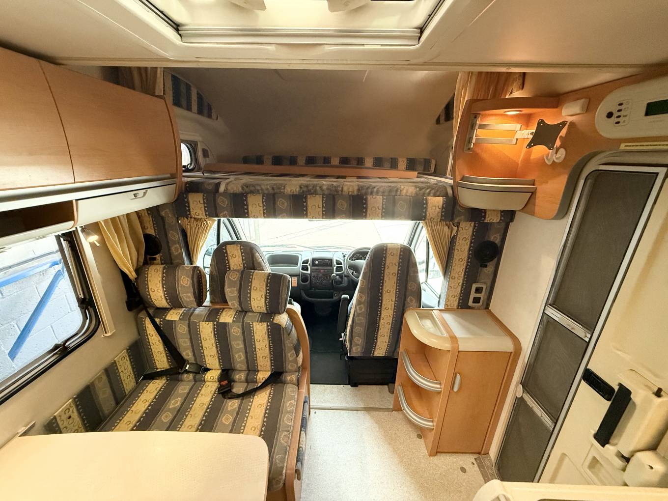 As you enter the motorhome to your left you have a good kitchen area with 3 Gas Burner Hob, Sink, Oven and Grill and lots of storage options. Across from the kitchen is the dinette area with 3 three-point seat belts and one lap-belt. This area also converts into a good sized double bed. Moving to the front you have the double bed above the Cab. To the rear there is a Washroom with Shower, cassette toilet and vanity unit - opposite is a large wardrobe.