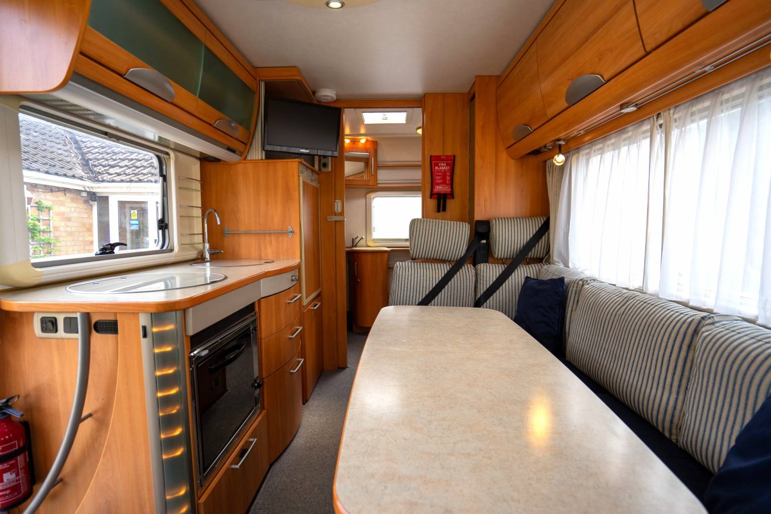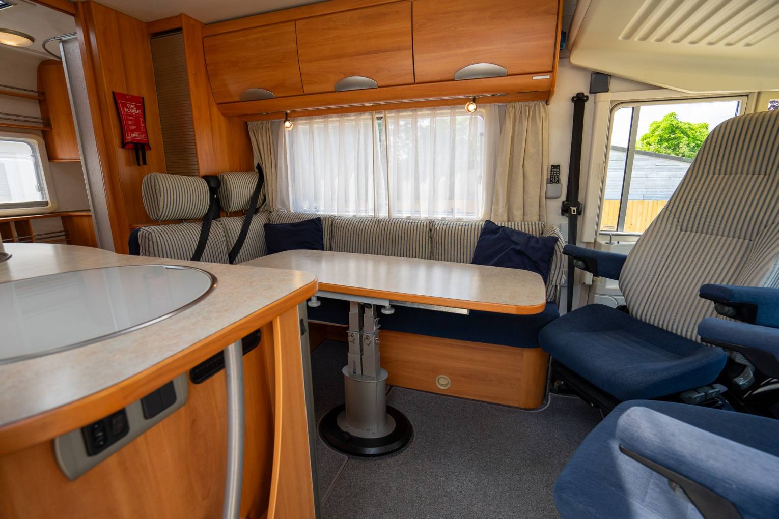 2005 Hymer B564 Compact 3 Berth A Class Motorhome with the sort after large rear washroom/Dressing room with a spacious Front L Shaped lounge and comfortable drop down bed.