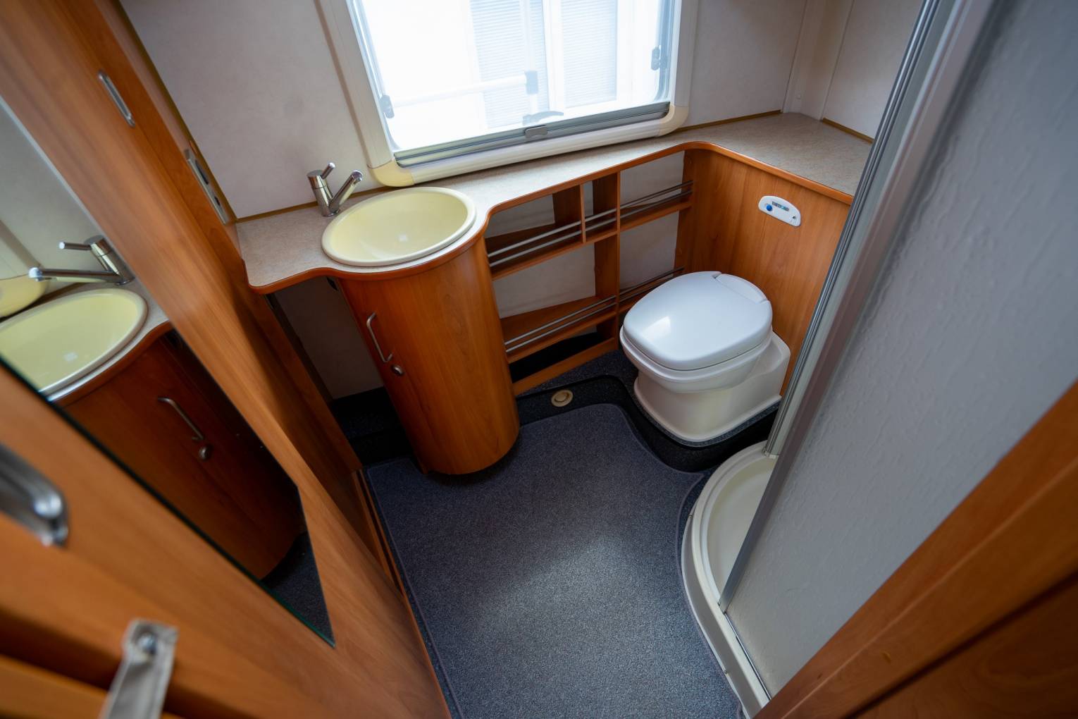 The rear of the motorhome features a large washroom with vanity sink unit, cassette toilet, separate shower cubicle, with a large Double sliding Door wardrobe for plenty of storage and plenty of space to get changed.