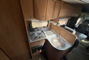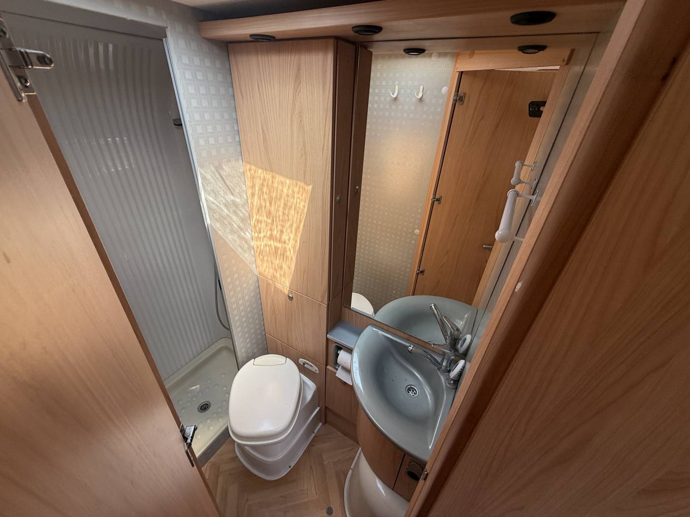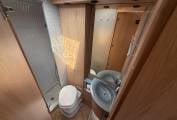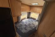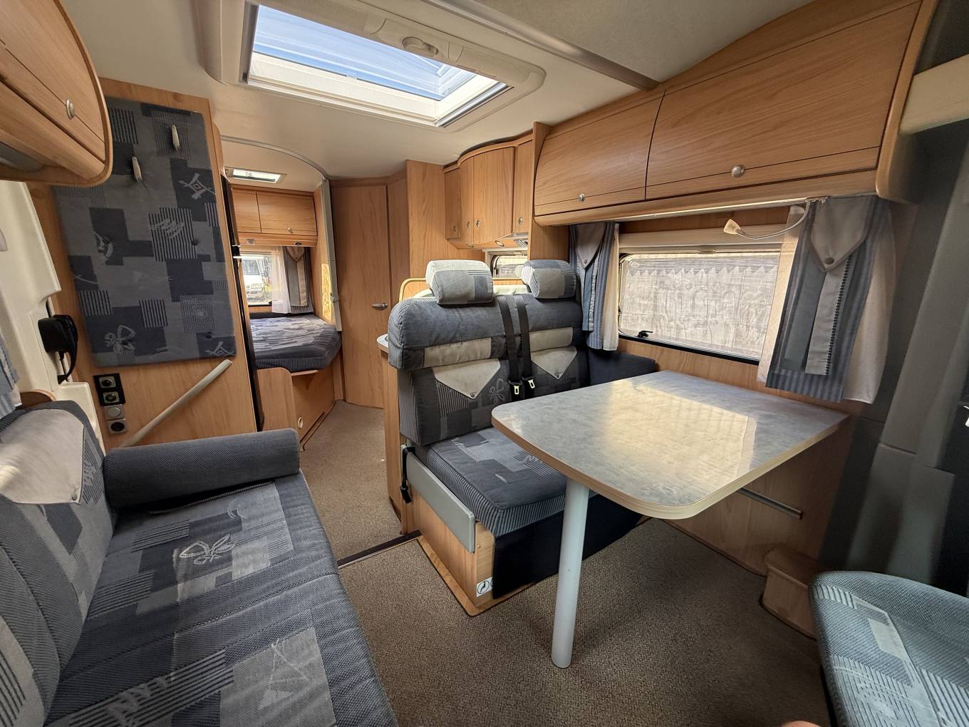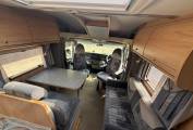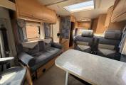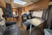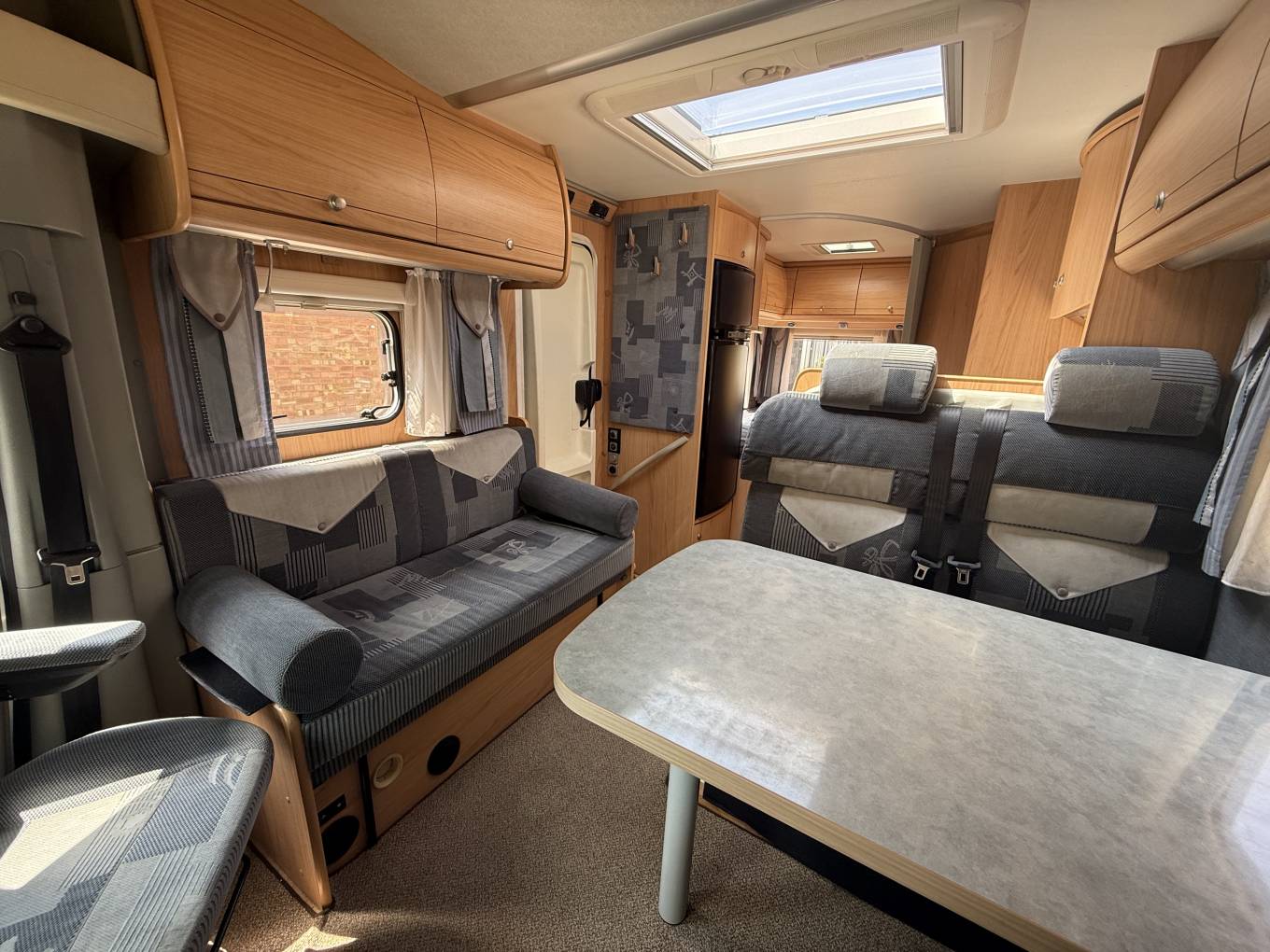 Entering this door via the low level step and turning left, is the large fridge with freezer above. Next to this is the fixed French bed with storage under and locker storage around the top. On the right is the washroom with separate shower, toilet and hand basin Turning around and on the left is the kitchen area with sink, 3 ring gas hob and microwave under Moving on to the lounge-dining area, on the right is the long lounge seat and opposite this is a double seat with two 3 point seat belts. the table removes to make a double bed Moving on to the cab area, the driver and passenger seats are Captain swivel seats. This Burstner Delfine is a great motorhome to get your journey underway, you also have included to make those staycations more comfortable, fitted with wind-out canopy awning,