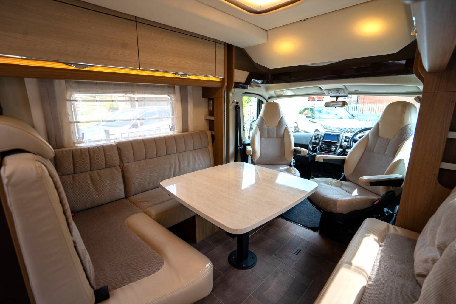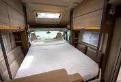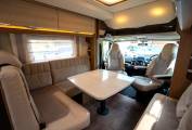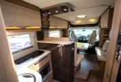 Behind the cab is the lounge dinette which consists of an L-shaped sofa fitted with two seatbelts and on the other side you have a side facing two seater sofa. There is a solid multi-directional dining table which can be manoeuvred into a variety of different positions and when you swivel the two front seats around you can sit six people down for dinner or drinks in comfort. Multiple overhead lockers provide plenty of storage space and these are finished in a very stylish brown trim.