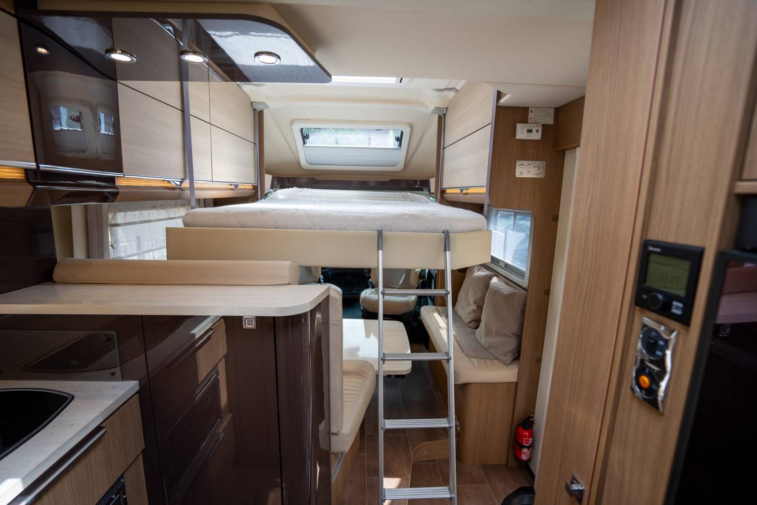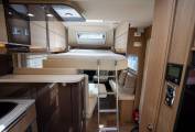 Above the lounge you have a Queen size electric drop down bed that retracts back into the roof when not in use to free up your living space. It can lowered half way when the lower berths need to be used. For a couple it can lowered to seat height for easy access.
