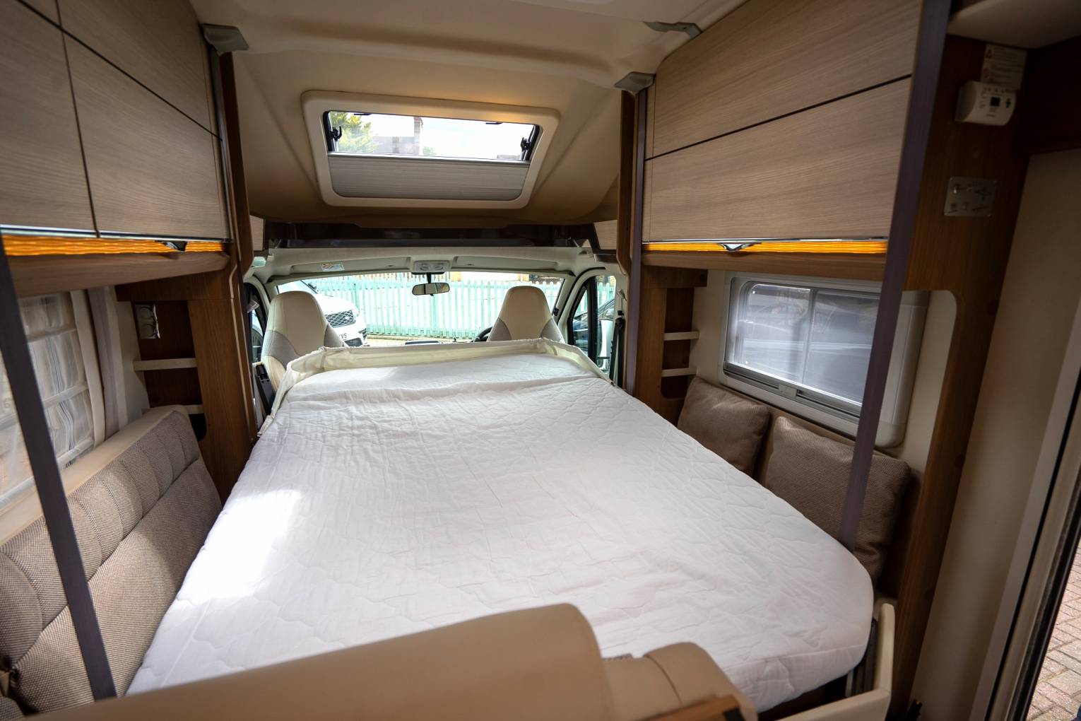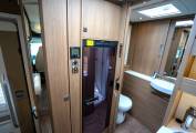 At the rear you have a large bathroom with a separate shower with a Perspex screen. There is also a Thetford cassette toilet with electric flush, a wash basin with a mixer tap, plenty of cupboard space, 2 large mirrors and a skylight in what is one of the most impressive motorhome bathrooms you will see.