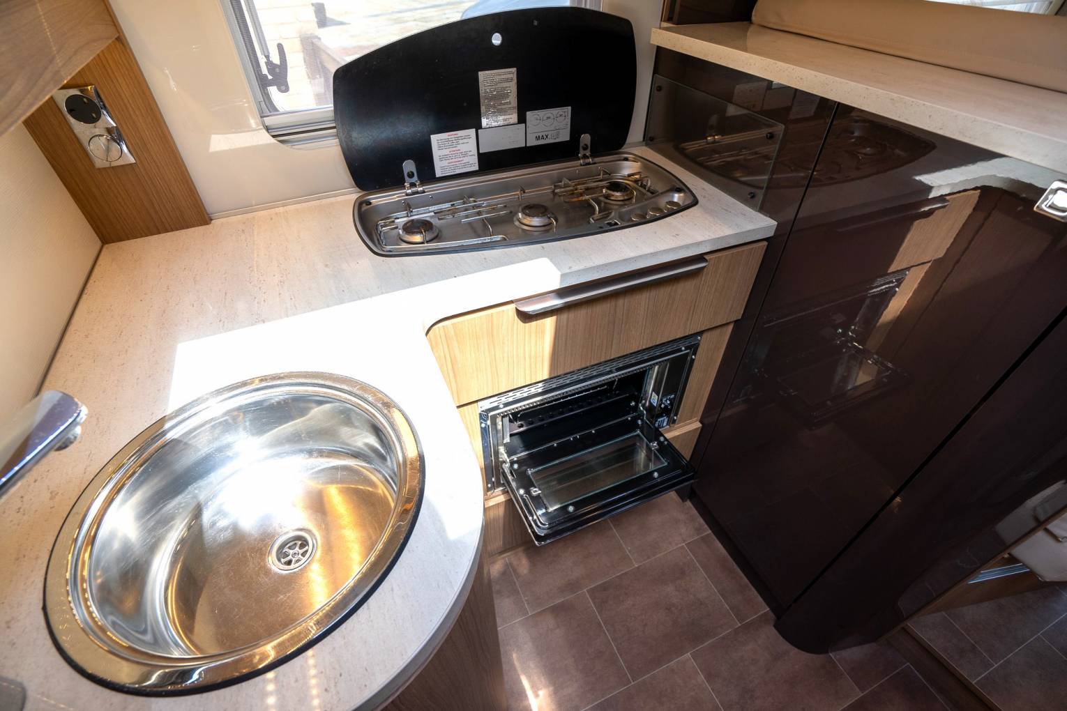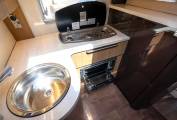 The mid-kitchen has a substantial amount of cupboard and locker space to store your utensils and groceries. There is a full length fridge freezer with automatic selection and on the opposite side is a gas oven and grill, a 3 gas burner hob, a stainless steel sink and mixer tap and a very generous worktop area by motorhome standards.