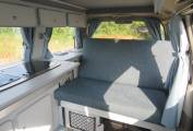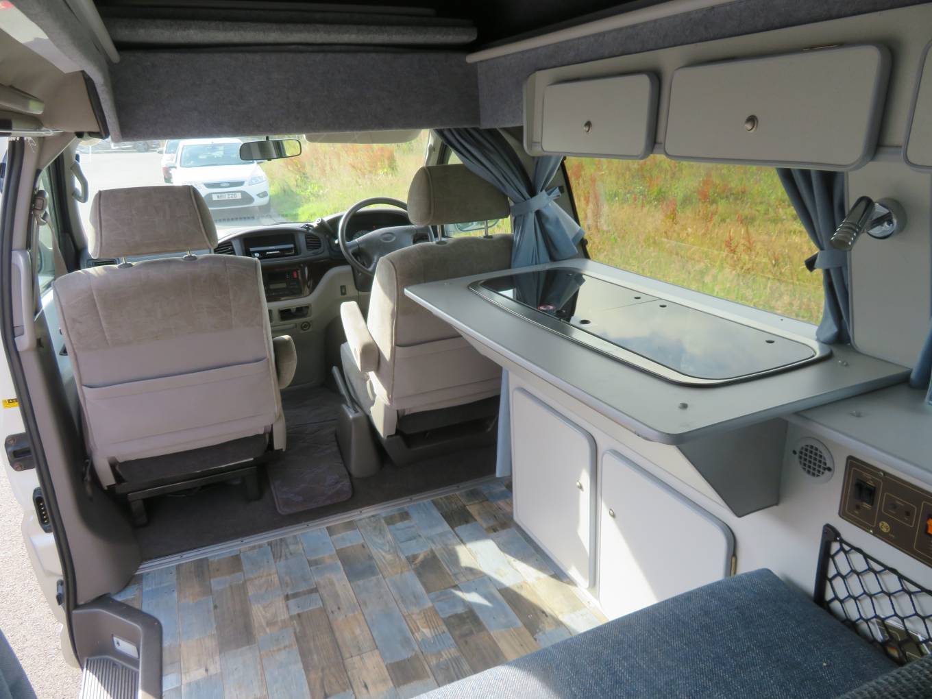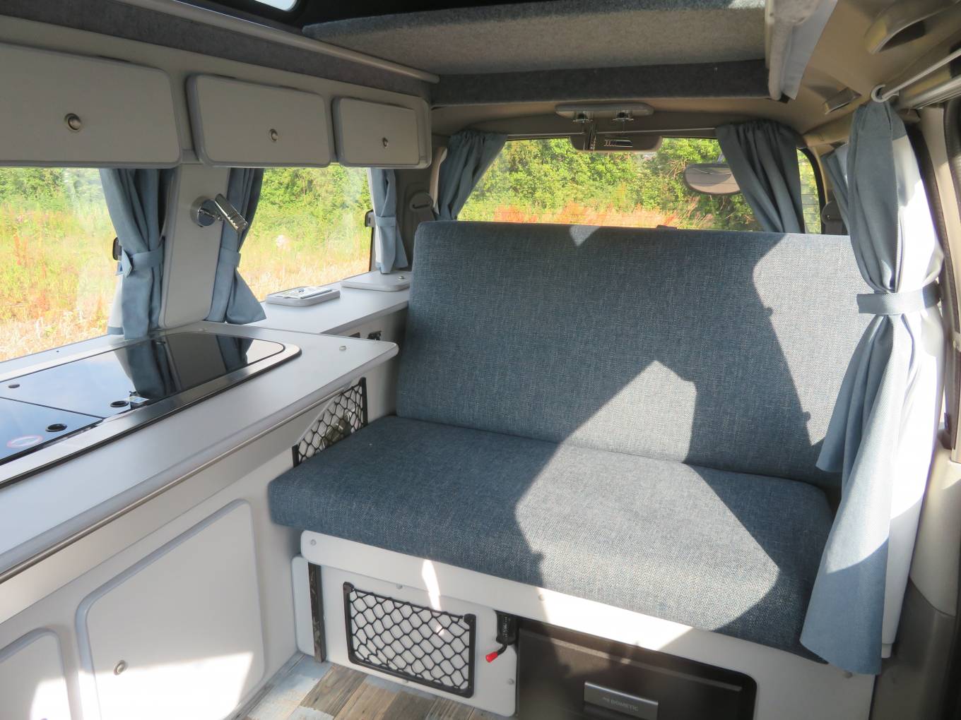 Complete with 2 seat belts, 2 burner gas hob, sink, under-seat coolbox, DAB Radio, 240v sockets and 12v lighting. This lovely camper was professionally kitted out in 2019 and has had very little use since. Perfect for couples, a generous sleeping area for 2 on the fold flat sofa bed and further sleeping for 2 younger children above if required. There is ample storage under the seats , in the cupboards and up above in the roof space. Lovely comfortable long distance cruiser fitted with a smooth automatic gearbox and 2.7 Ltr petrol engine, generous seats, electric windows/ mirrors and power steering. The bodywork of the van is in exceptional condition for its age and looks stunning in pearl white, the interior conversion is still as it was when first converted due to a lack of use.