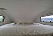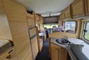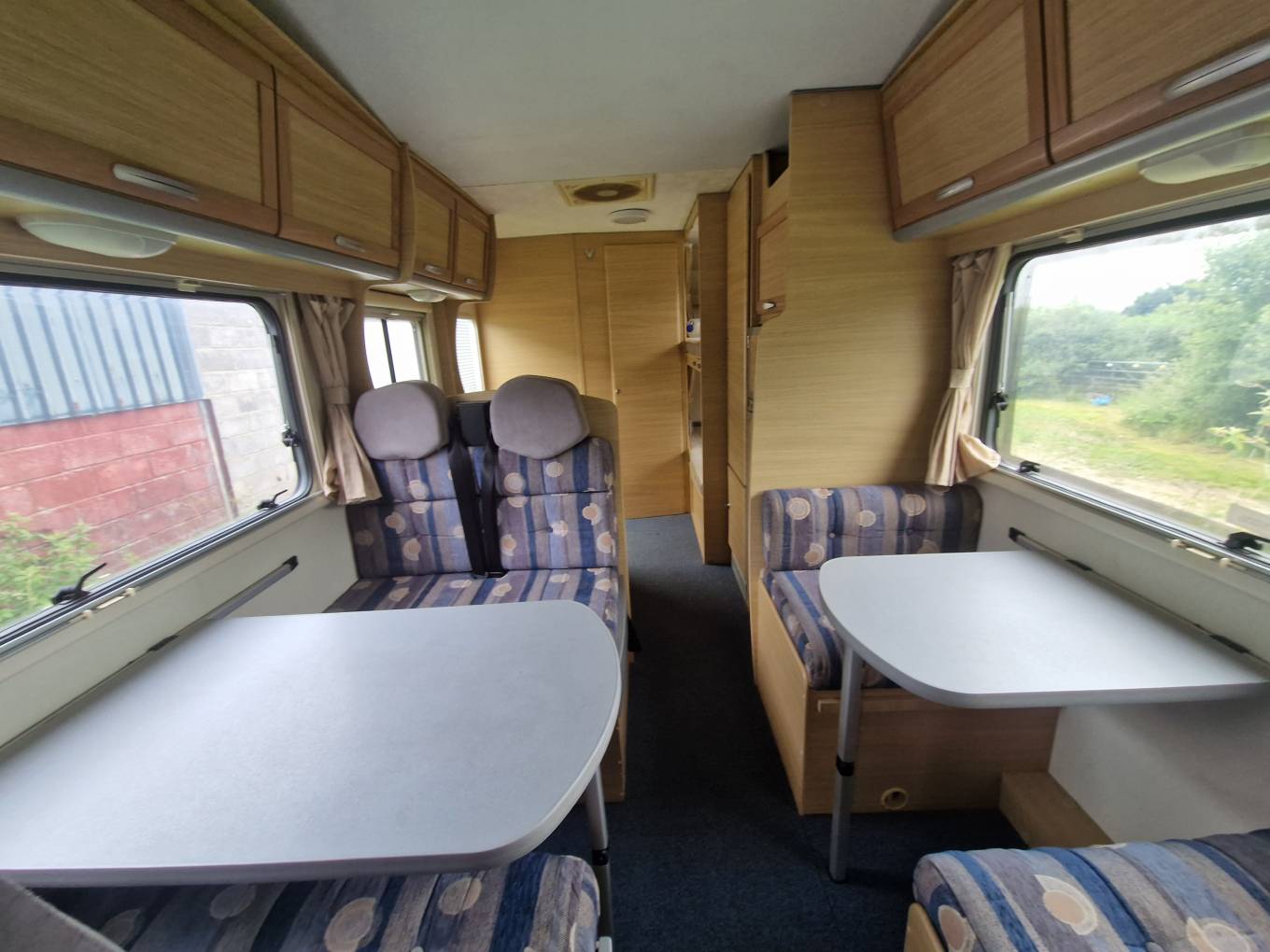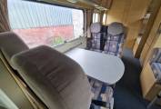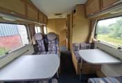 The lounge and dining area can seat 6 people, the offside area has two forward facing and two rearward facing seats, all with seat belts so six travelling seats in total. There is a large dining table that drops down to make up a full size double bed. The nearside area has a forward and rearward facing seat plus a dining table, again the table drops to make up a single bed. The over-cab bed is large and there is a window each side. During the day the bed lifts up on gas struts to give additional headroom in the cab.