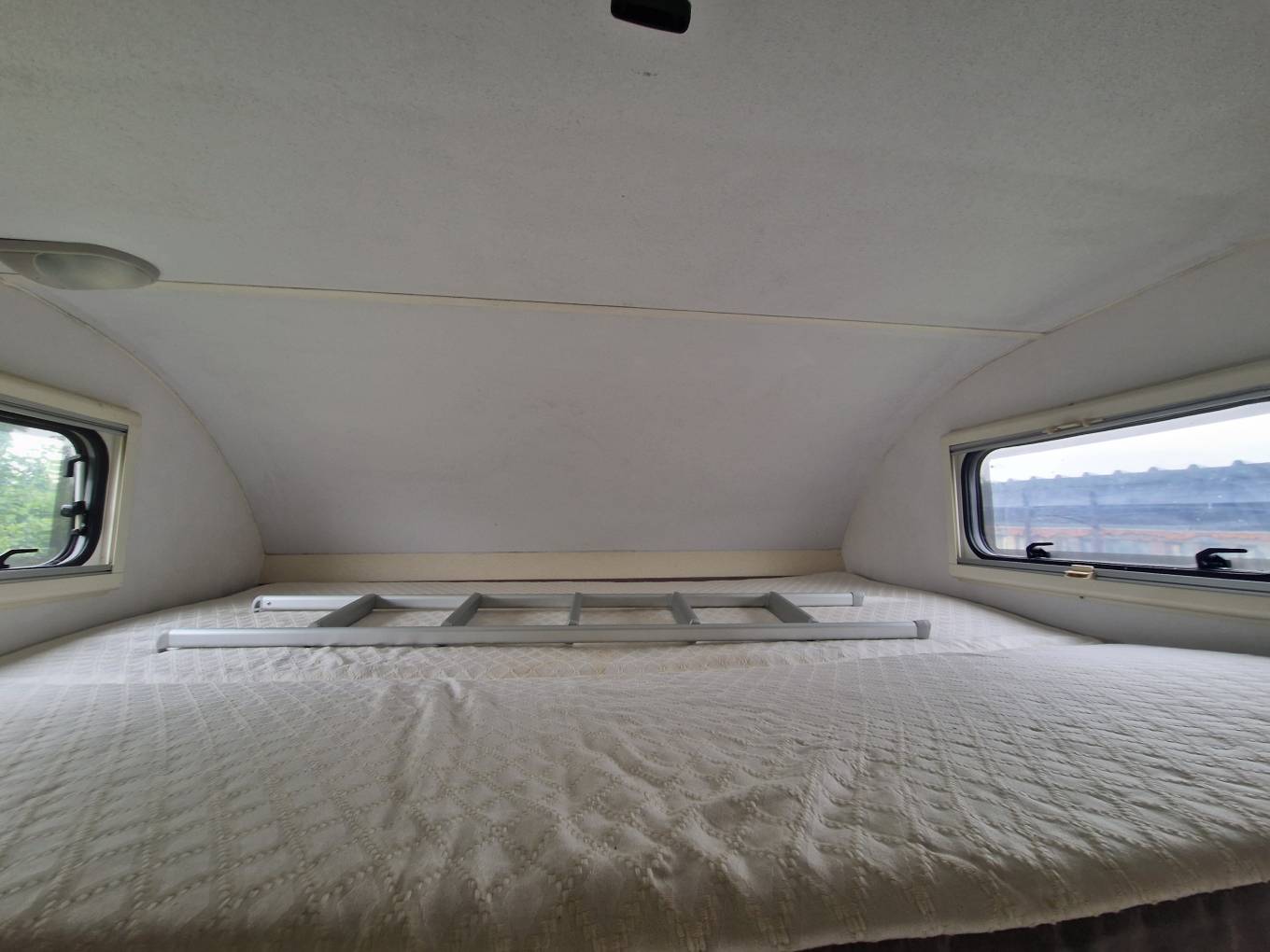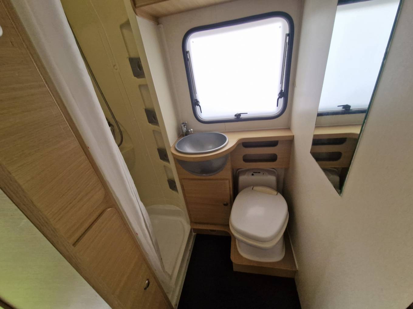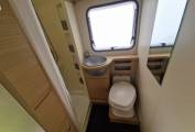 The rear near side has two bunk beds, the top bunk accessed with an aluminium ladder, plus there are reading lights and privacy curtains. The bottom bunk lifts and there is a very large access door from the outside making a very large storage area whilst travelling. The rear washroom has a separate shower cubicle with shower handset on a rising rail and a shower curtain, a good sized washbasin with chrome mixer tap and a Thetford cassette swivelling toilet with electric flush.