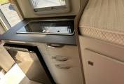 To the rear of the van there is 2 raised single beds that can be converted to one massive double. There are 2 large windows that allow the natural light to flood in. Above the bed is plenty of locker space. There is lots of storage under the beds and a small box in the steps leading to the bed.