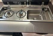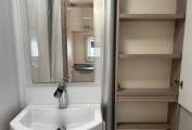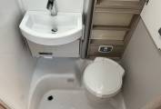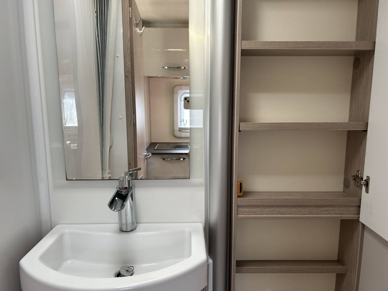 Opposite the kitchen is the washroom with shower, cassette toilet, hand basin with tap, storage and mirror.