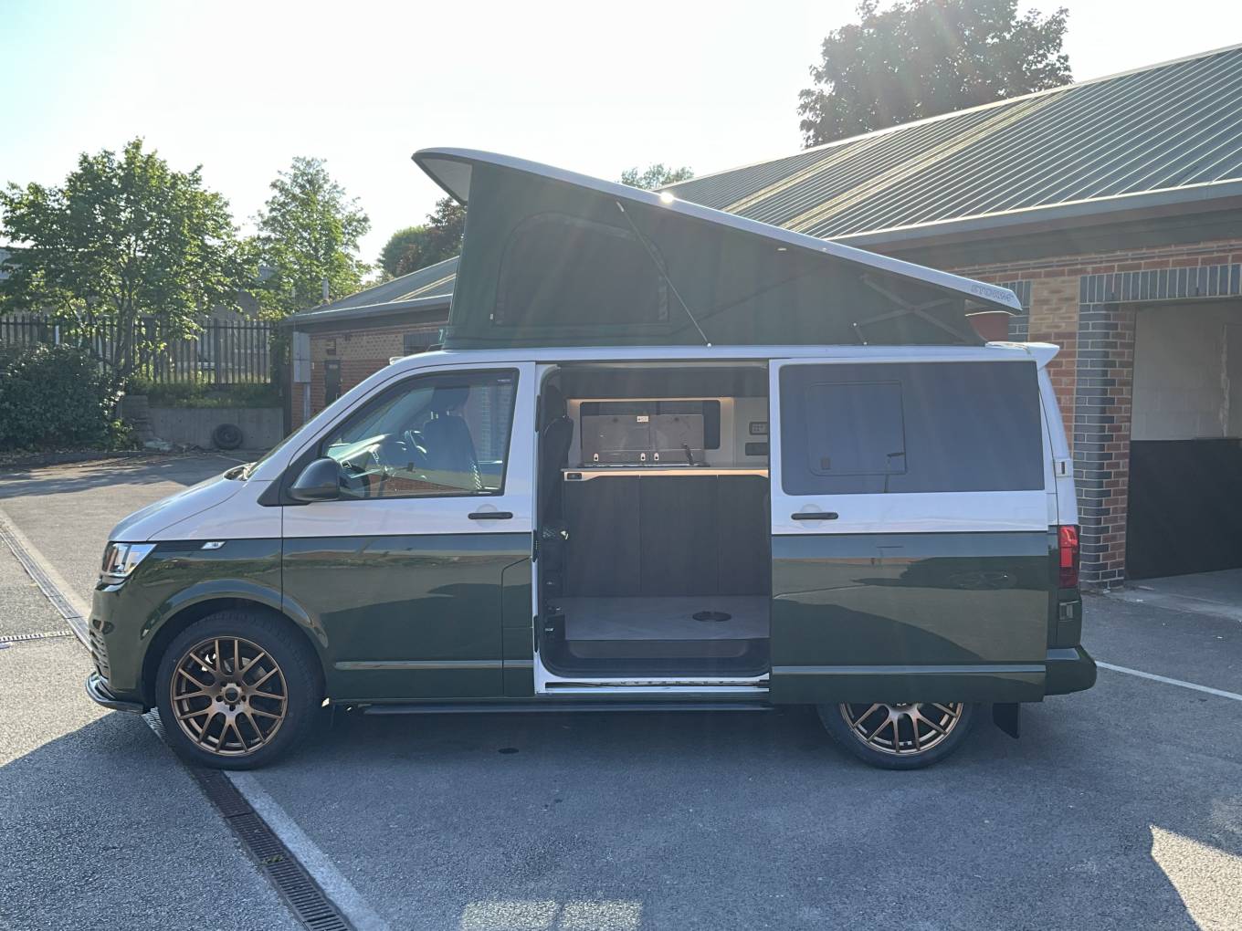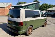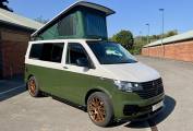 Crafted by Adventure Wagons & Caravans based in Nottingham, this VW T6.1 comes with a great spec. This model allows for use with both off-grid capabilities and on site camping alike. Featuring the stylish bronze green and white two-tone effect paint, Storm pop top and upgraded alloy wheels, this model stands out amongst the crowd.