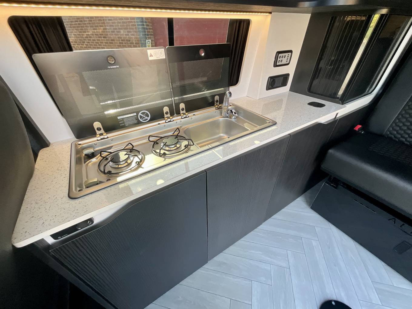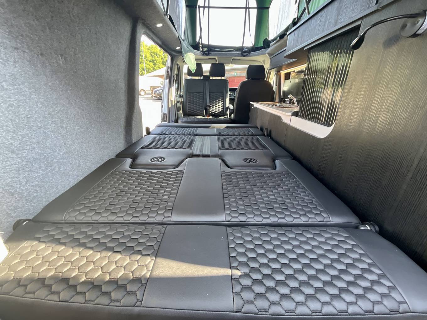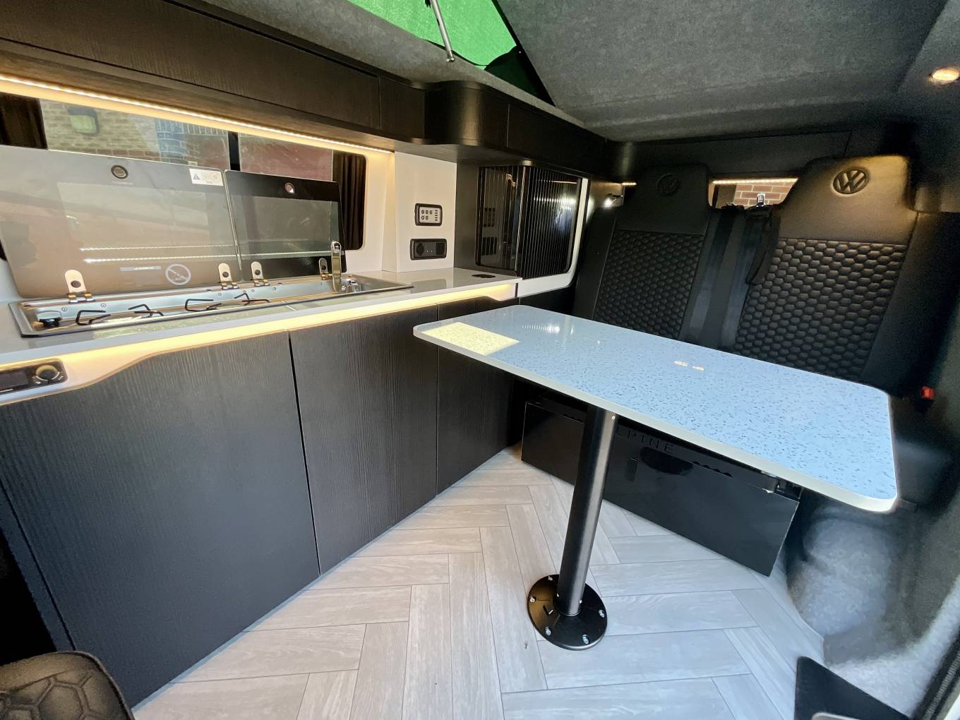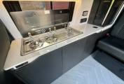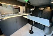 At the front, this van features a man made leather upholstered MS Craft swivel seat with underseat storage and rails to slide forwards that turns to face the lounge. To keep the van warm, the Autoterm diesel heater is fitted. Touch lighting with dimmers are featured throughout the van. Wireless charging is also available for a phone, along with USB points and 240 sockets.