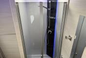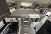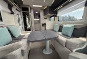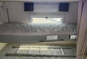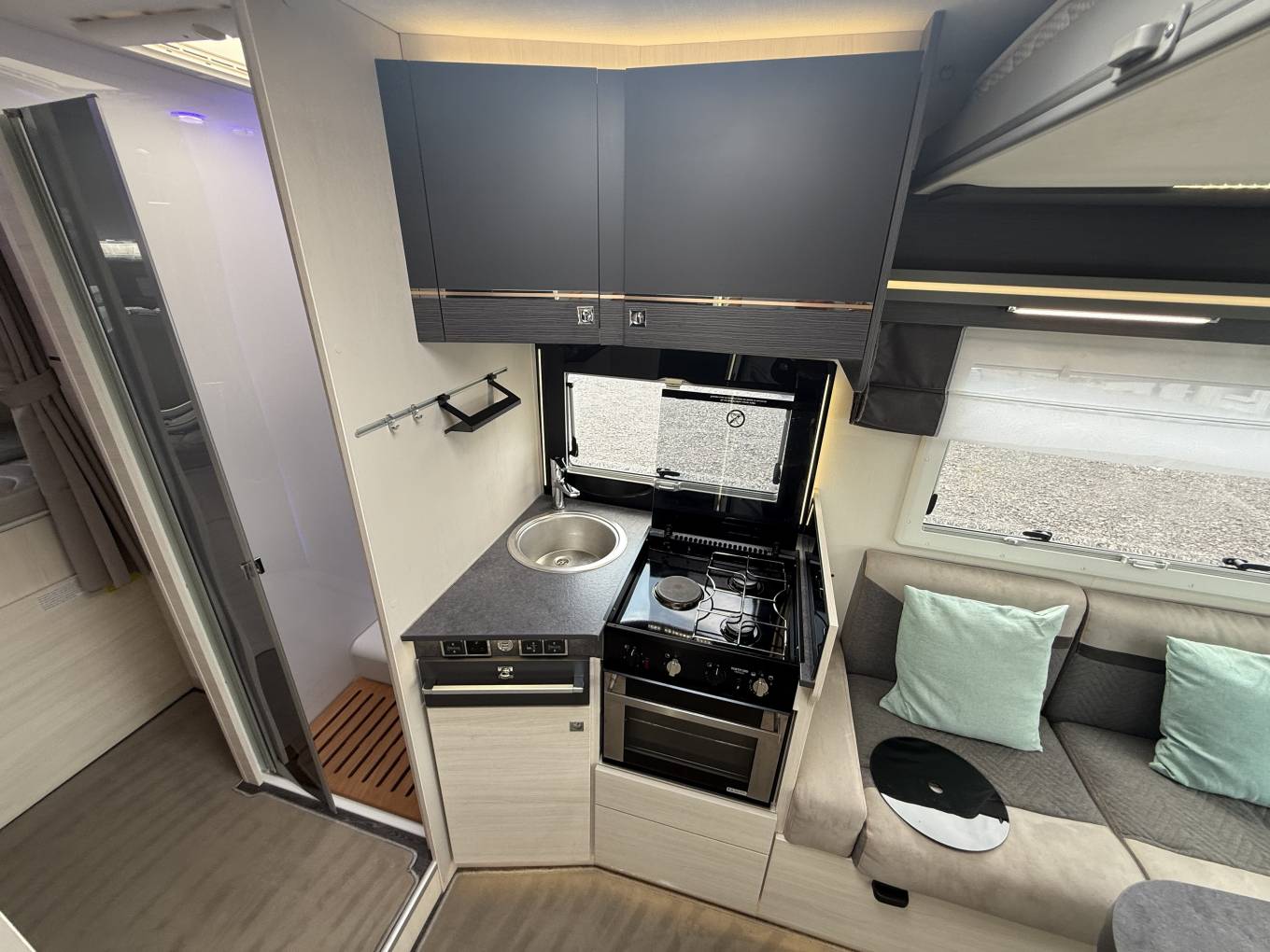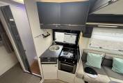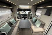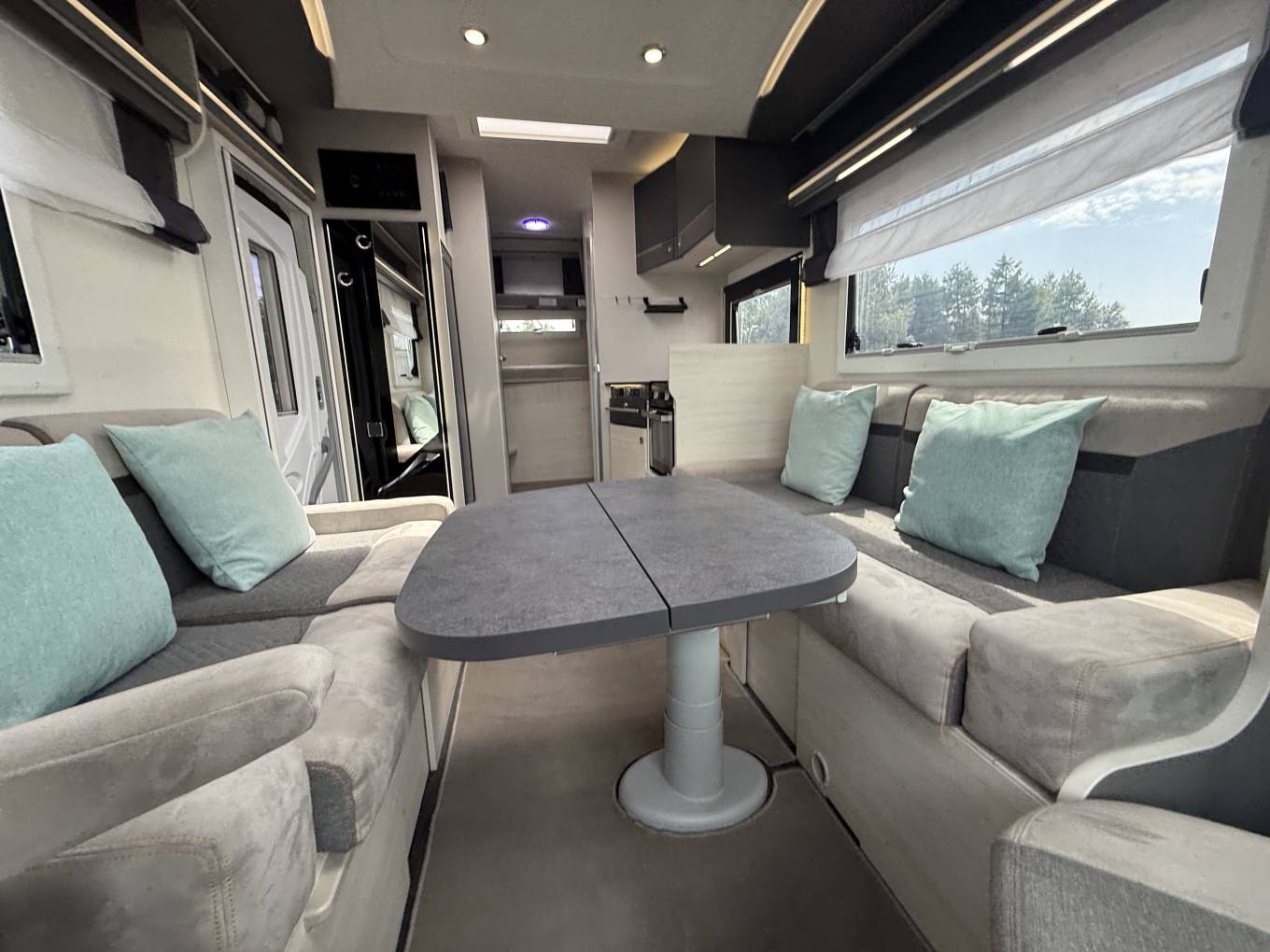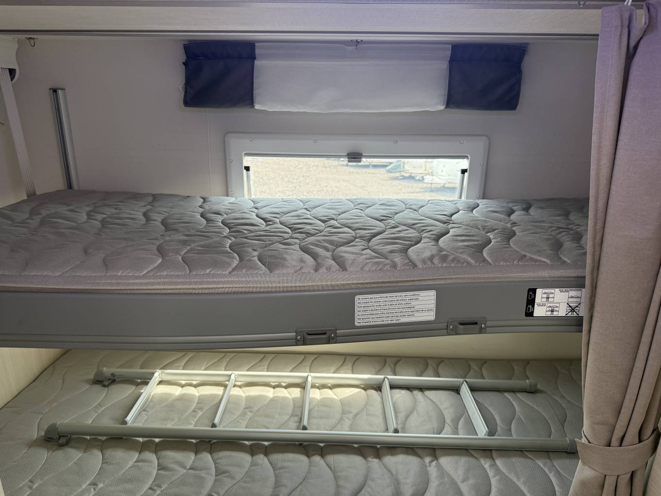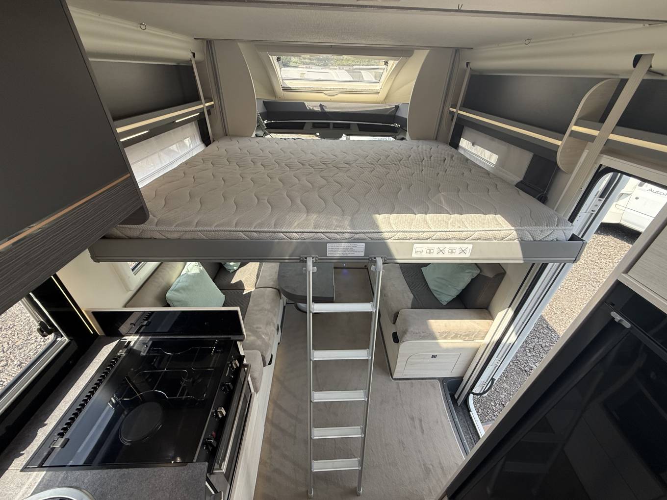 From its rear you have a large garage with external access on both sides, ideal for storing bikes, toys, or other family travelling essentials over single modern bunk beds that can be manually and electronically adjusted to give more room for either storage or bed space, moving forward you have the well-laid-out kitchen which is fully equipped with a 2 gas burner hob and an electric plate, oven, sink, and a large fridge/freezer. The spacious and light lounge has 2 bench seats sitting across from each other with an electric height adjustable dining table for eating at or for socialising with an electric drop down double bed above. This area has an Avtex TV and the 2 cab seats swivel.