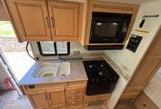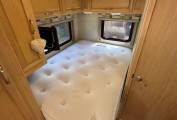 The slide-out is situated to the front of the vehicle to the lounge and dining area and provides great extra floor space when extended. The C- shaped sofa offers both a great dining area and also converts to a double bed with the use of the removable table.