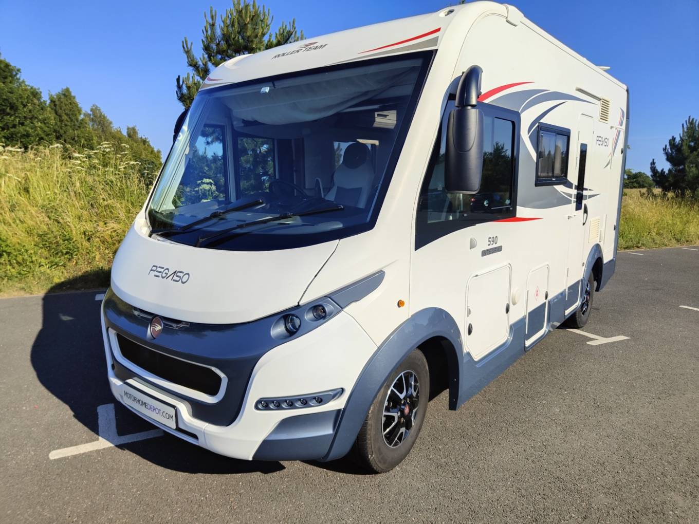 This is an AS NEW example of the superbly designed 2019 Rollerteam Pegaso 590. This sub 6 metre, sub 3500kg A class motorhome is incredible in regards to what can be achieved in a small space. With the superb front drop down bed that is synonymous with A class vans, a spacious front dinette area that utilises the 2 rotating Captains seats, a well equipped centre kitchen and a rear bathroom that includes a separate shower. This example includes a Tracker, reverse camera, solar panel, Avtex tv and a 4x cycle rack. Based on the excellent Fiat Ducato cab, this 2.3 multijet derivative has the 6 speed manual gearbox, cruise control and cab aircon. 12000 miles from new with great history. To include a new Hab check and engine service. Based on kent and greater london border. Additional pictures available.