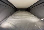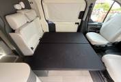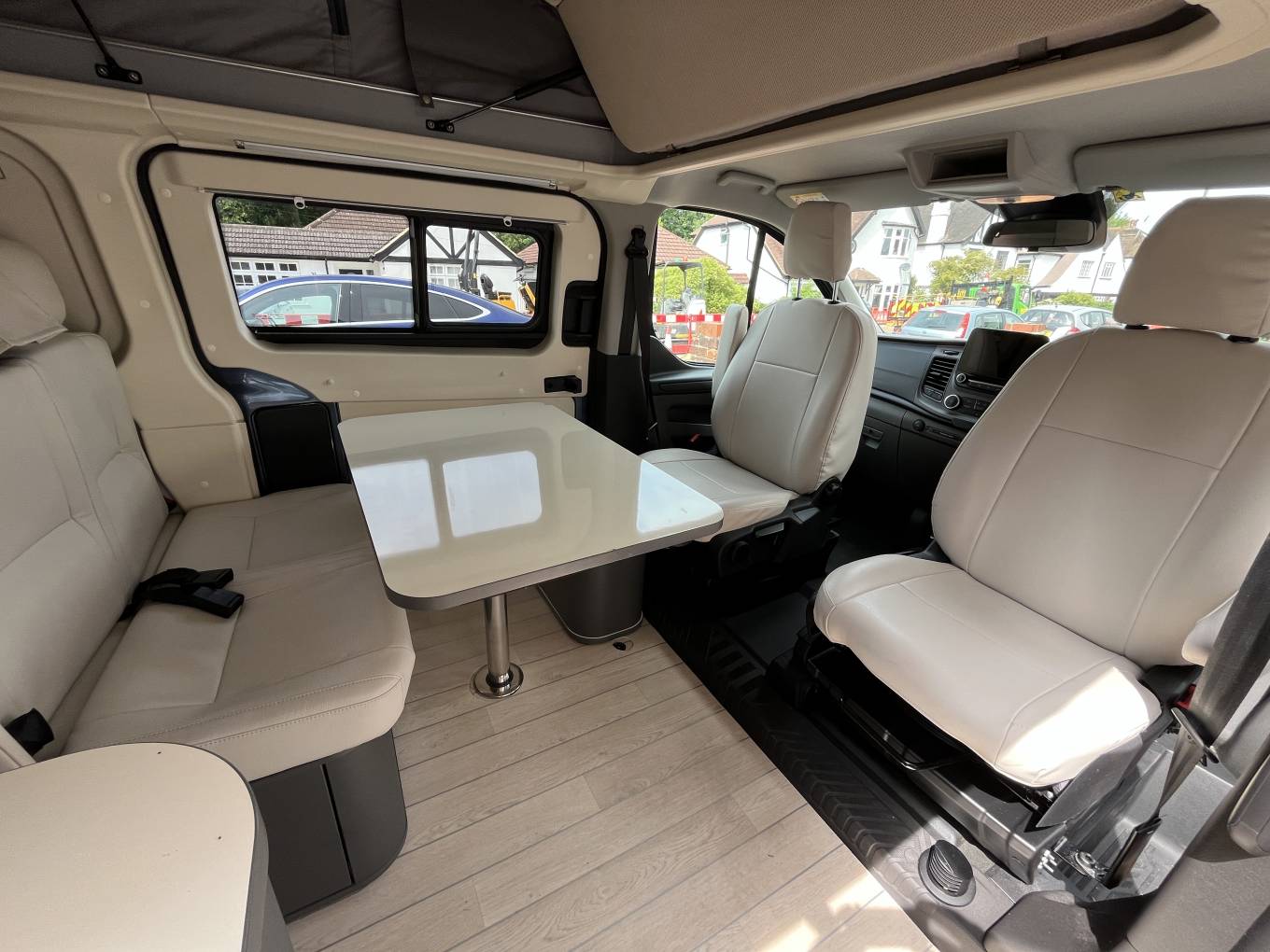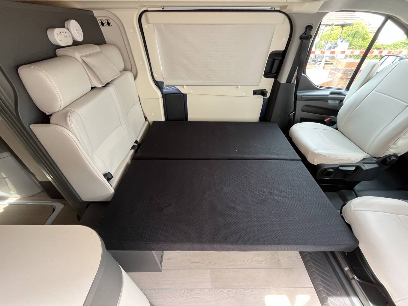 4 seats & 4 berths: Two belted forward seats plus a modular bench that folds into a lower double (1.9 × 1.2 m), and a pop‑up roof with a Froli-sprung upper bed (pop-top) sized around 1.9 × 1.2 m