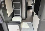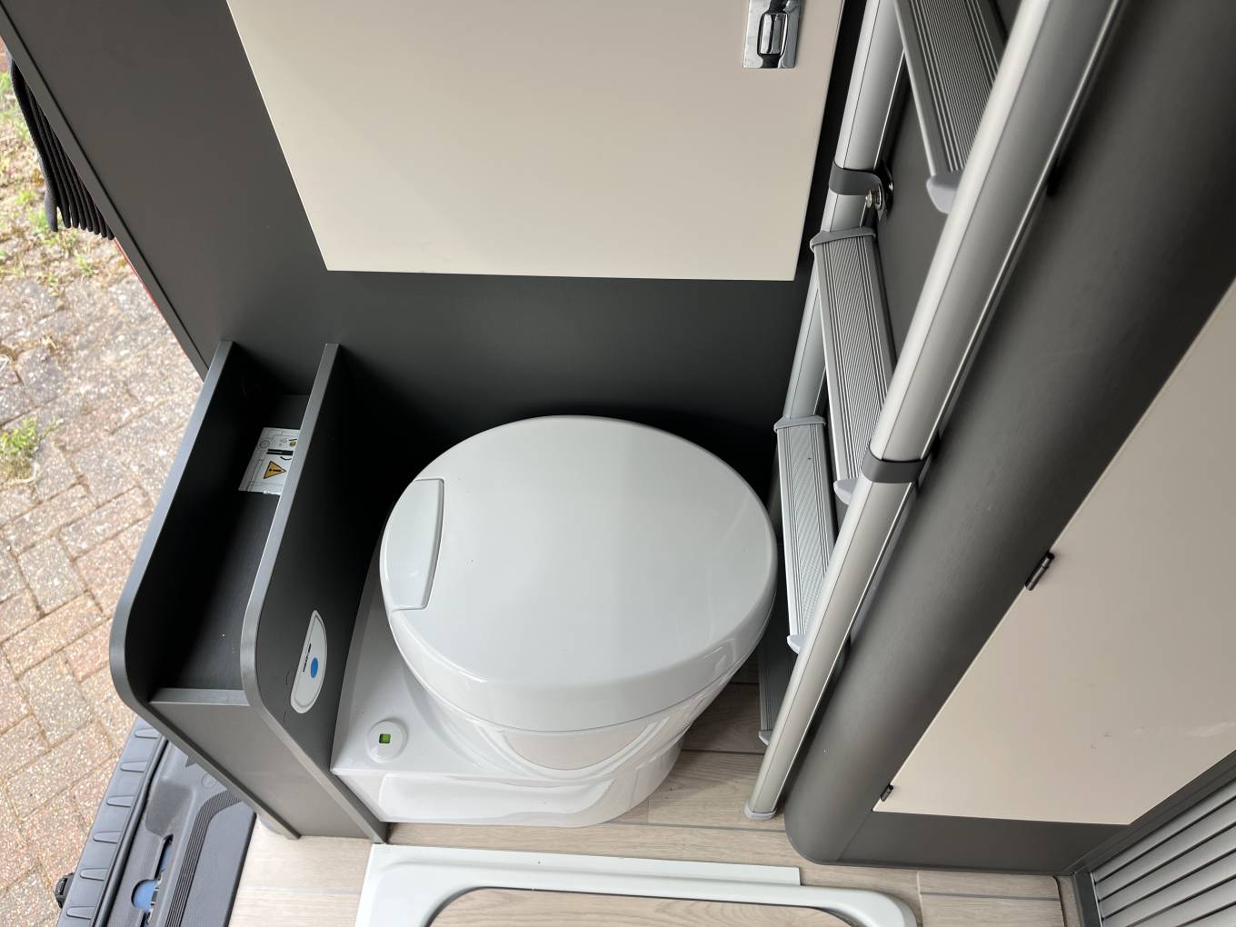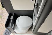 Wet room at the rear includes a shower tray, cassette toilet with curtain for privacy — exceptional for a van this size