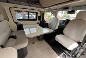 Double sliding side doors open up to a bright lounge with swivel cab chairs and a fixed dining table