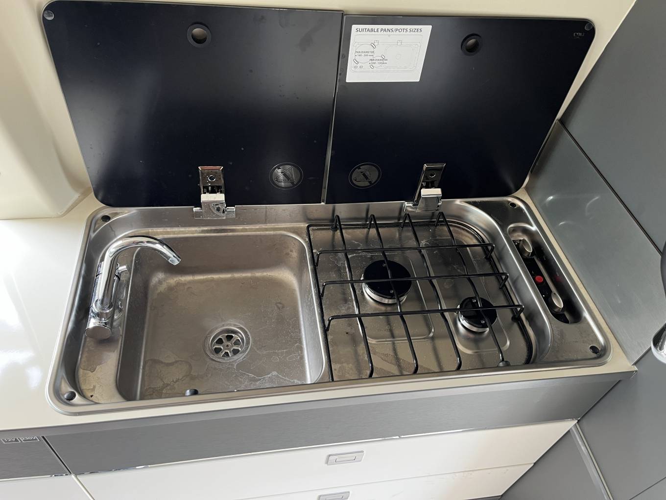 Galley kitchen in the center with double gas hob, 51 L compressor fridge, stainless sink, hot & cold running water, and ample storage