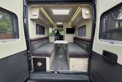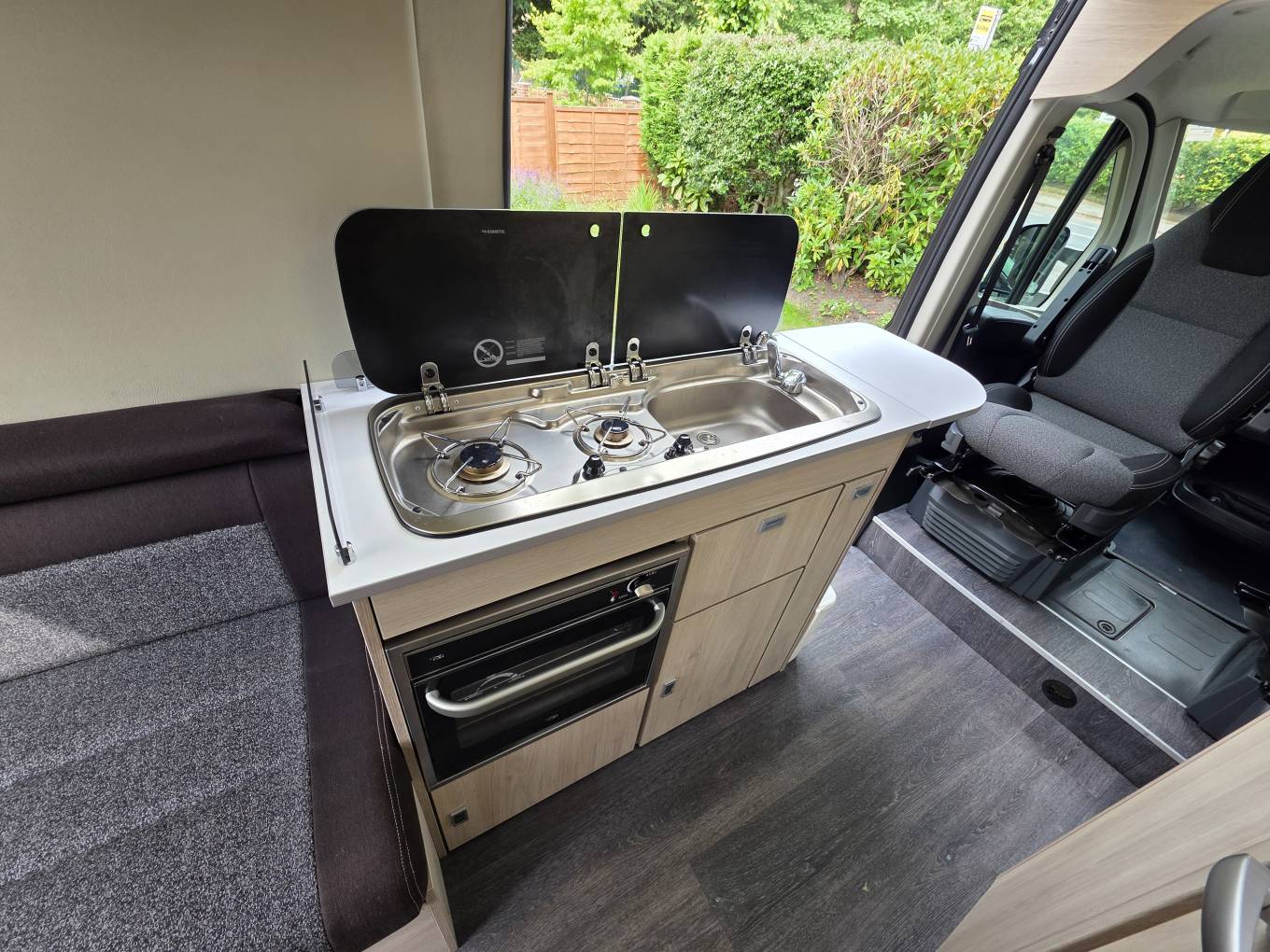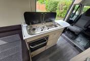 The living area is spacious and bright, yet still gives you everything you need. Starting from the rear of the van there is a rear lounge area made up of two side facing bench sofas. This is a great place to put you feet up and relax. There is also a table stored in one of the cupboards, that can be put up in the centre for an ideal place to enjoy and evening meal or snack. The Expedition comes with compact but well equipped kitchen which comprises of oven, grill, hob with 2 gas burners, stainless steel sink with tap and Dometic 3-way Fridge. At the front the two front seats swivel round.