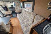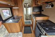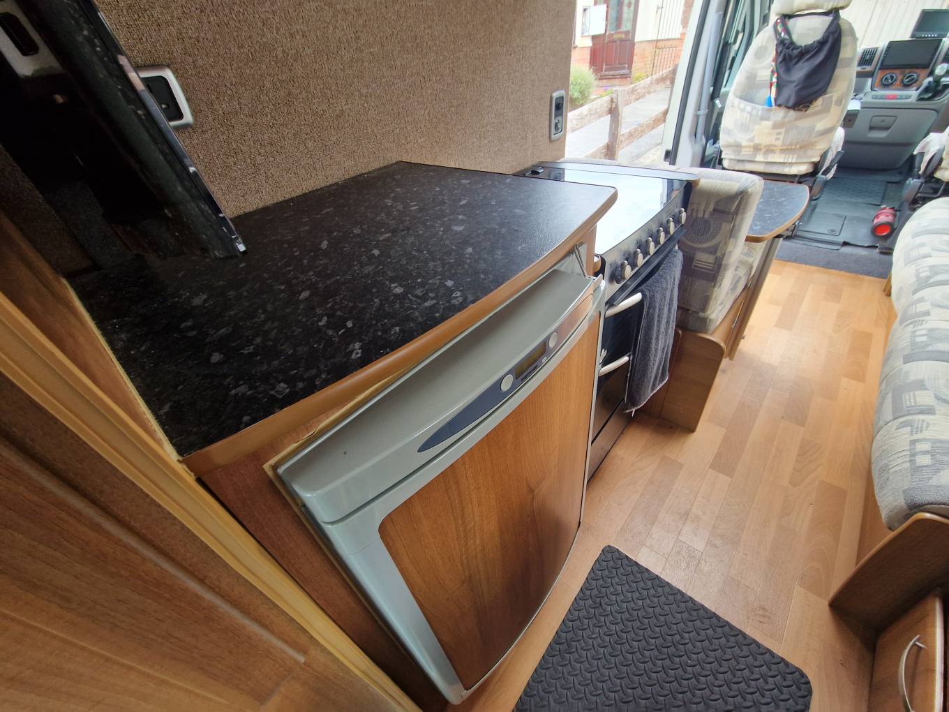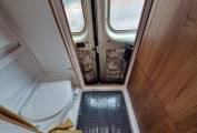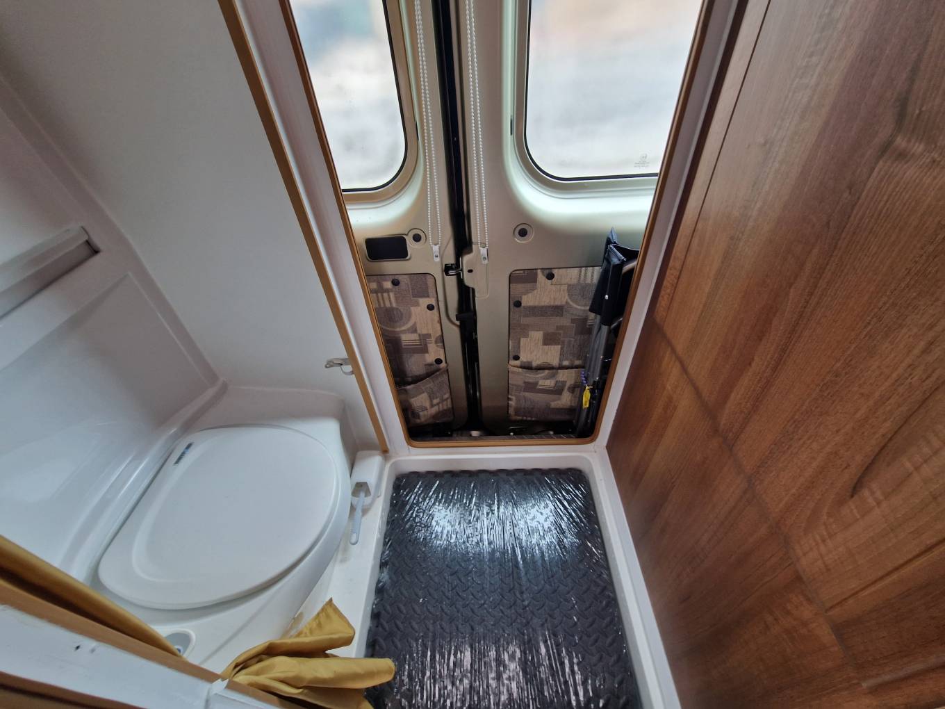 Internally it has a front lounge, central kitchen and a rear washroom. Upfront both seats swivel which creates a comfortable seating area for 6 people. Each window has both blinds and fly screens including the windows in the cab area and overall the windows are double glazed. There are loads of extras on this campervan which make it exceptional value. It has the diesel Eberspacher heating system, 2 x 110amp leisure batteries, 3 way automatic fridge, large oven, 3 gas burners and 1 x 240volt hot plate and sink with water purifier added to it. Other high spec features include an electric skylight,front and rear reversing camera and sensors, underslung LPG tank, solar panel, electric entry step,TV and directional TV aerial, VB comfort kit, semi air suspension system and electric powered awning which winds out at the flick of a switch, and a tow bar.