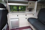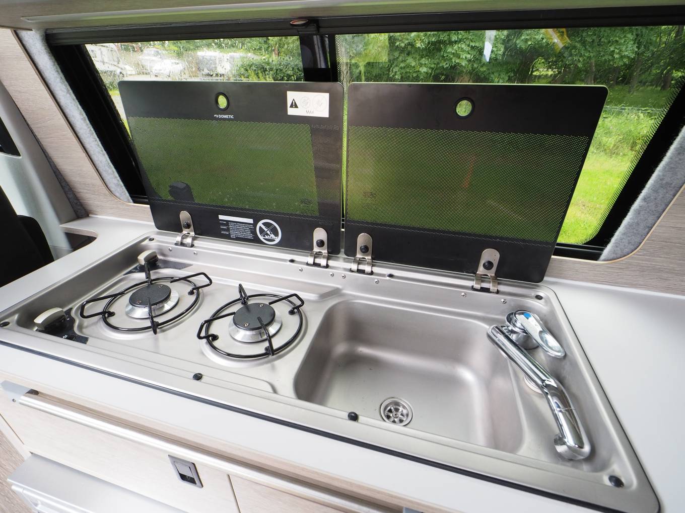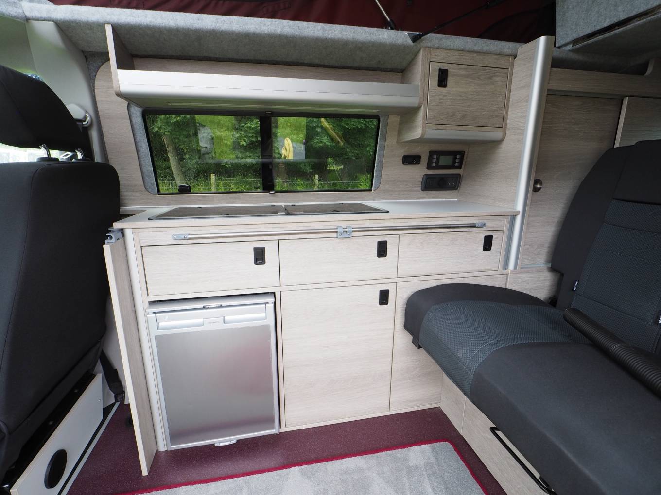 A colour coded Storm Pop Top with articulated bedboard and mattress provides 4 berth accomodation alongside the Rib Bed which has two seat belts. The Pop Top is a scenic canvas with a front window and two side vents. A two burner gas hob and sink with tap alongside a 12v fridge with freezer box provide on board kitchen facilites. There is an Autotherm diesel heater, 180w Solar panel and 100aH Lithium leisure battery. The front passenger seat swivels and there is an occasional table to provide space for eating, entertaining or even working.