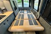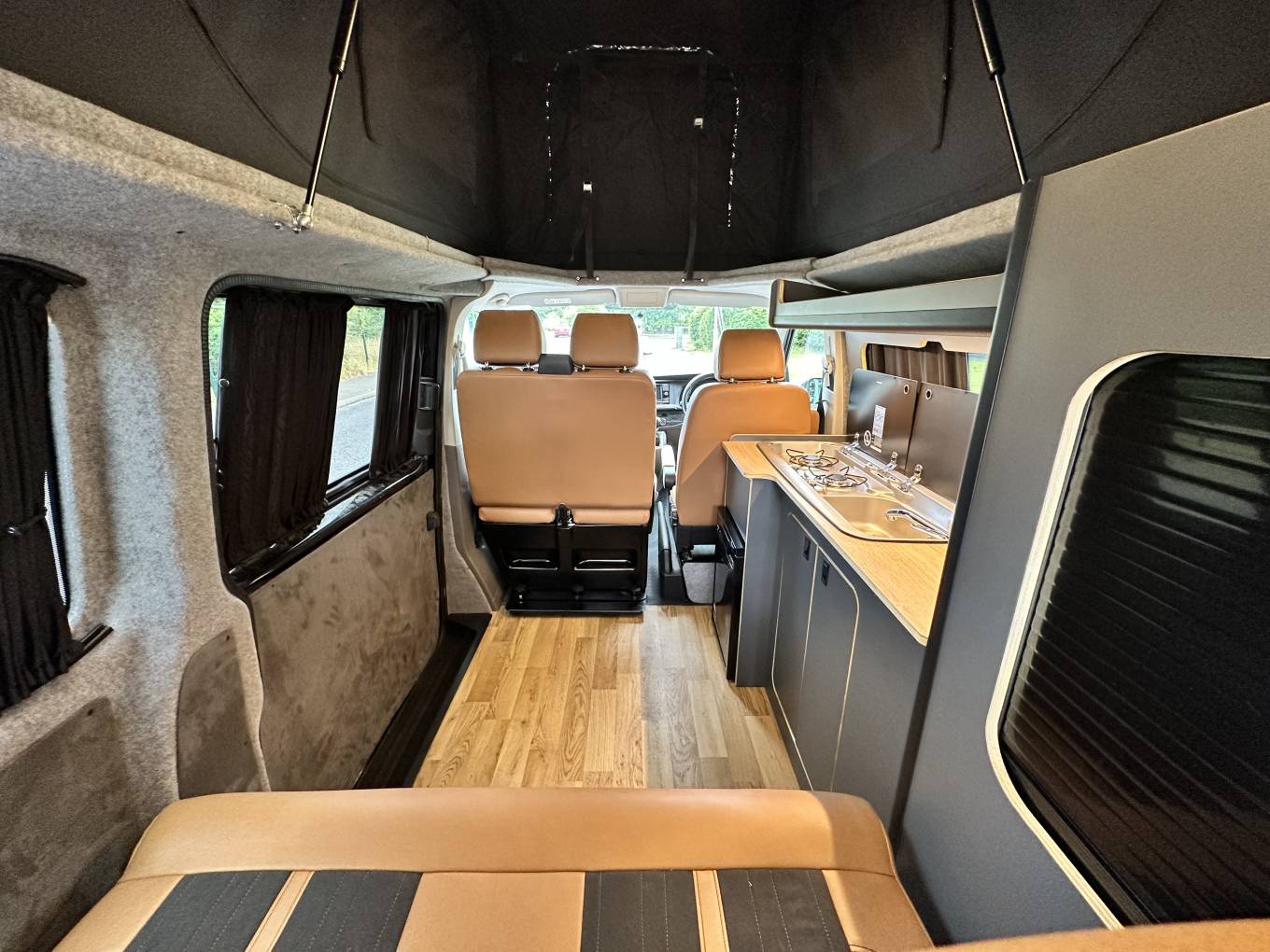 Entering through the side door we are greeted by the attractive interior with stylish matt grey units complimented by wood effect worktops and flooring. There is an abundance of storage along with a Dometic combination sink/hob and Alpicool Fridge. The rock and roll bed features two additional 3 point seatbelts and also creates a comfortable double bed. For Dining the front double passenger seat can swivel to allow four to sit around the large removable table. You will find the second sleeping area in the pop top which has a panoramic canvas giving plenty of natural light. When this is not being used it pushes up to maximise head room.