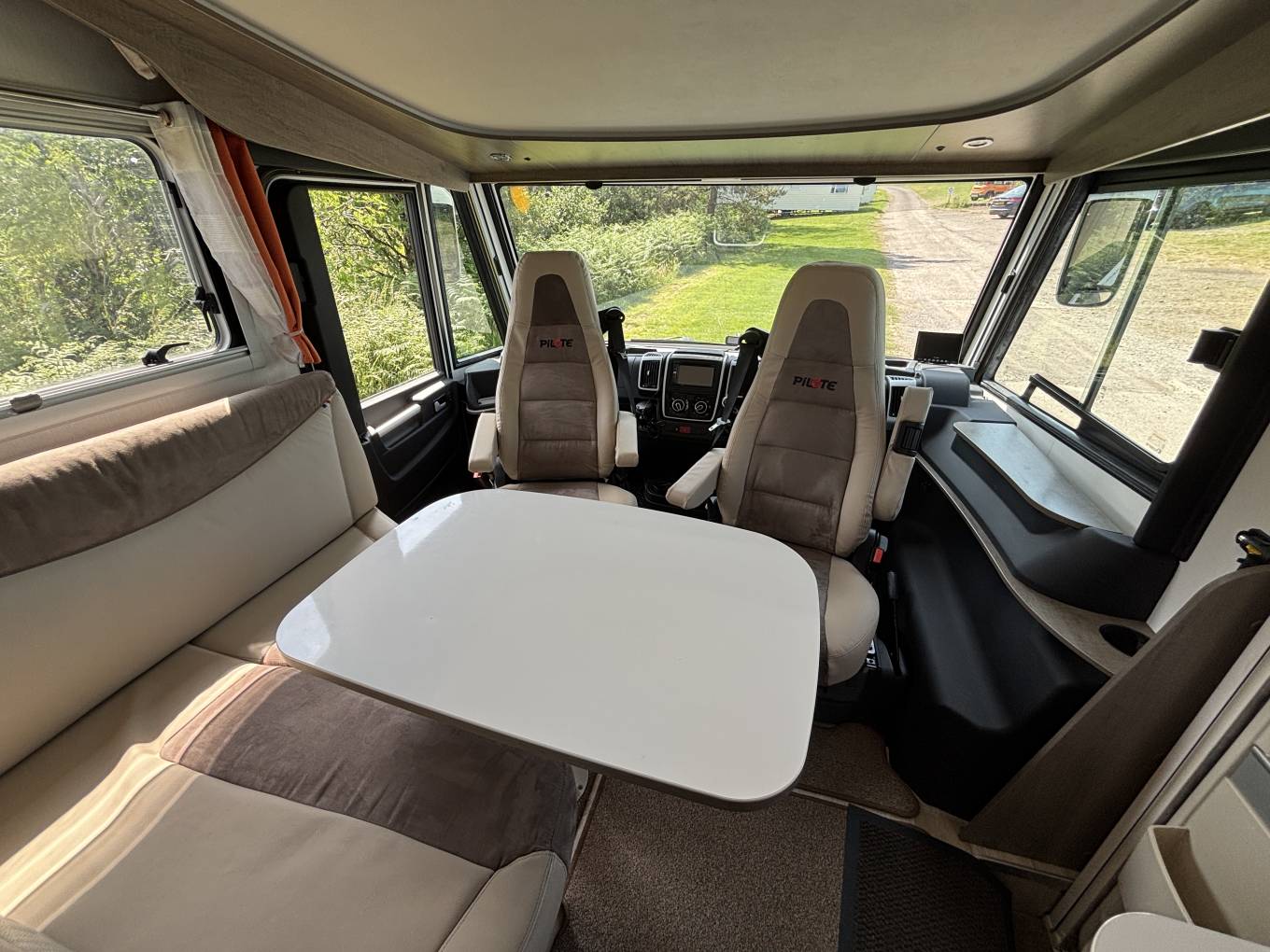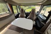 As you enter the habitation area of the motorhome on the drivers side, there is an L-shaped dinette with the two additional 3-point travelling seatbelts and the 2 swiveling driver and passenger seats. Above the dinette, is the double drop-down bed.