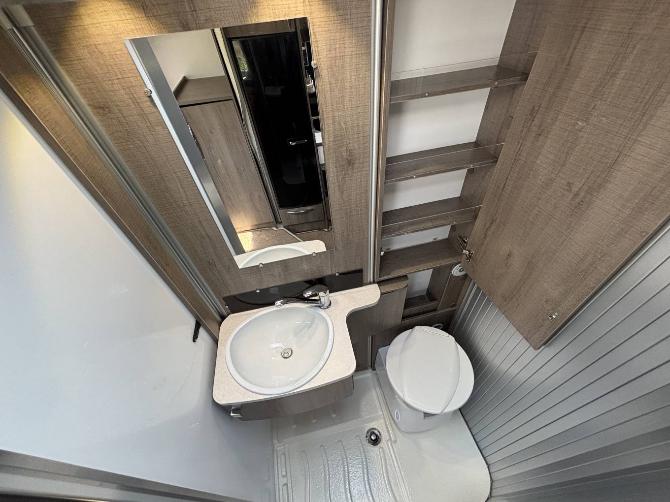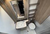 On the far side is the shower room with a 12v flushing cassette toilet, wash hand basin, mirror, storage and a shower cubicle which is created from a clever opening design of the vanity unit.