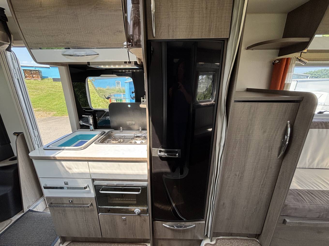 To your left as you enter is the kitchen area which includes a gas oven/grill unit, 2 ring gas hob, sink with hot and cold mixer tap, fridge freezer, pull out extra worktop and storage.