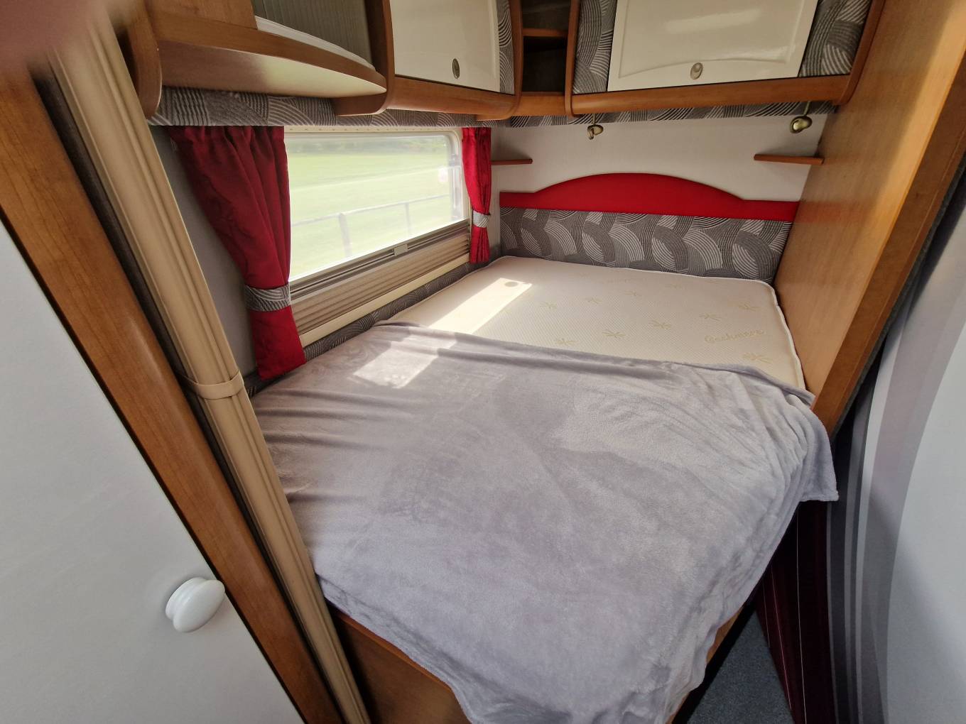 There is a large fixed double bed at the rear with high level storage and a bracket for a TV.