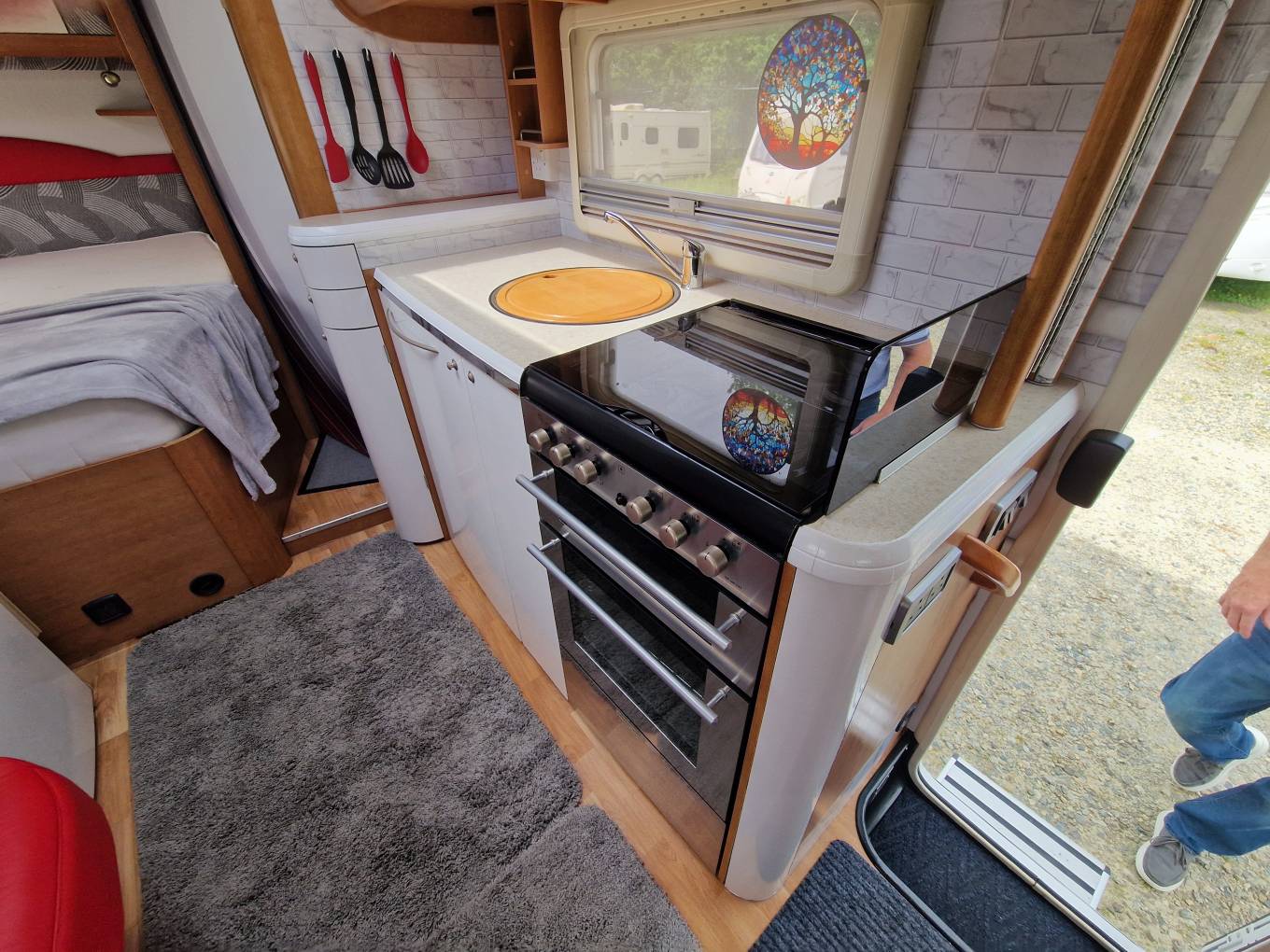 Food preparation can be a breeze in the well equipped kitchen area with an oven and grill, hob-burner, microwave, fridge and of course, sink and tap, with plenty of low and high level storage.