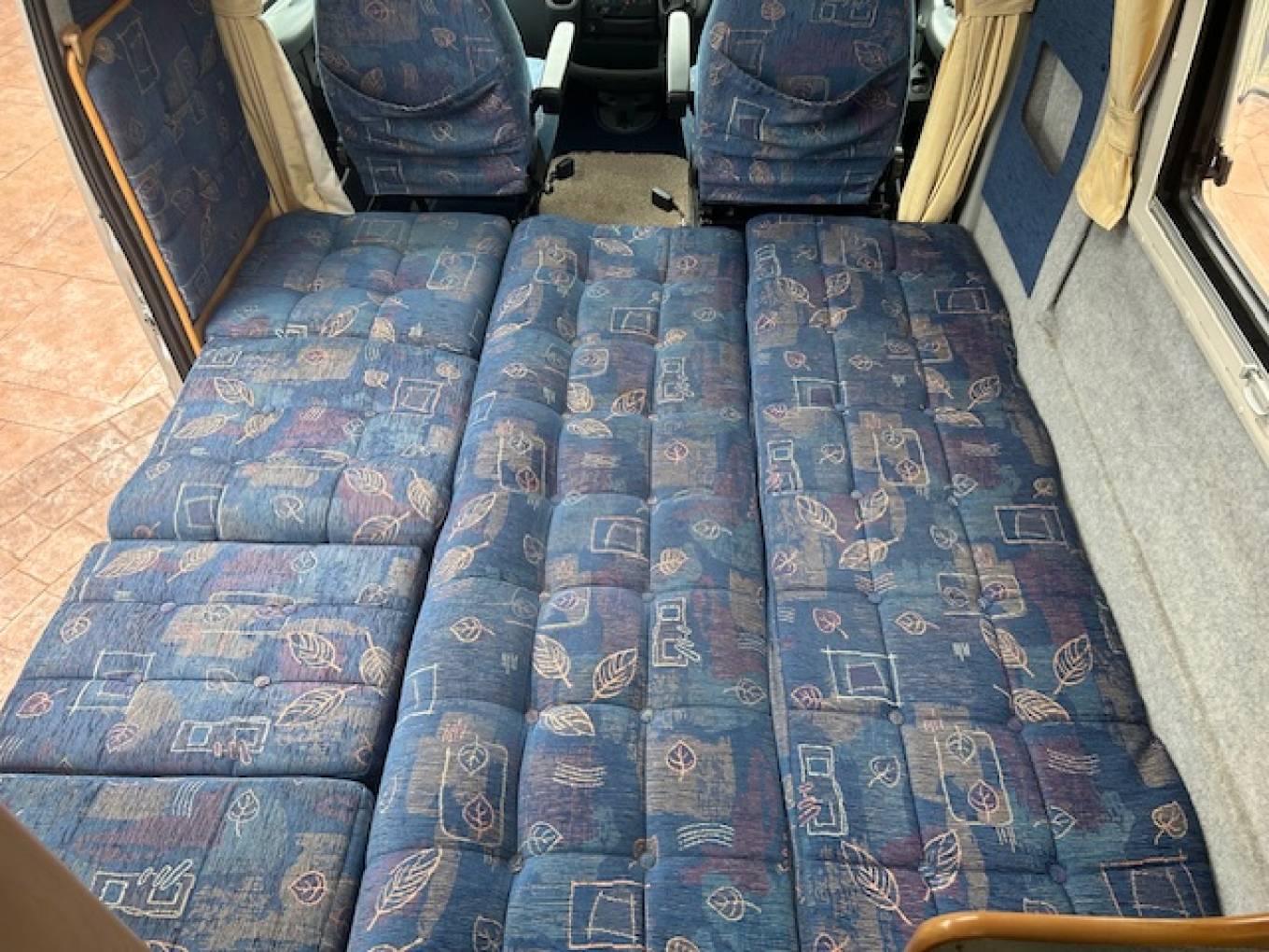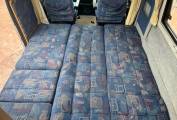 The large bench seat and two single seats, one with a travelling seatbelt, can be converted into a large double bed at the front of the camper.