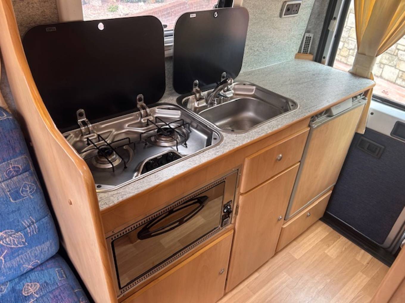 The galley kitchen is equipped with a Smev 2 burner hob, Smev grill unit, a sink and a Dometic fridge.