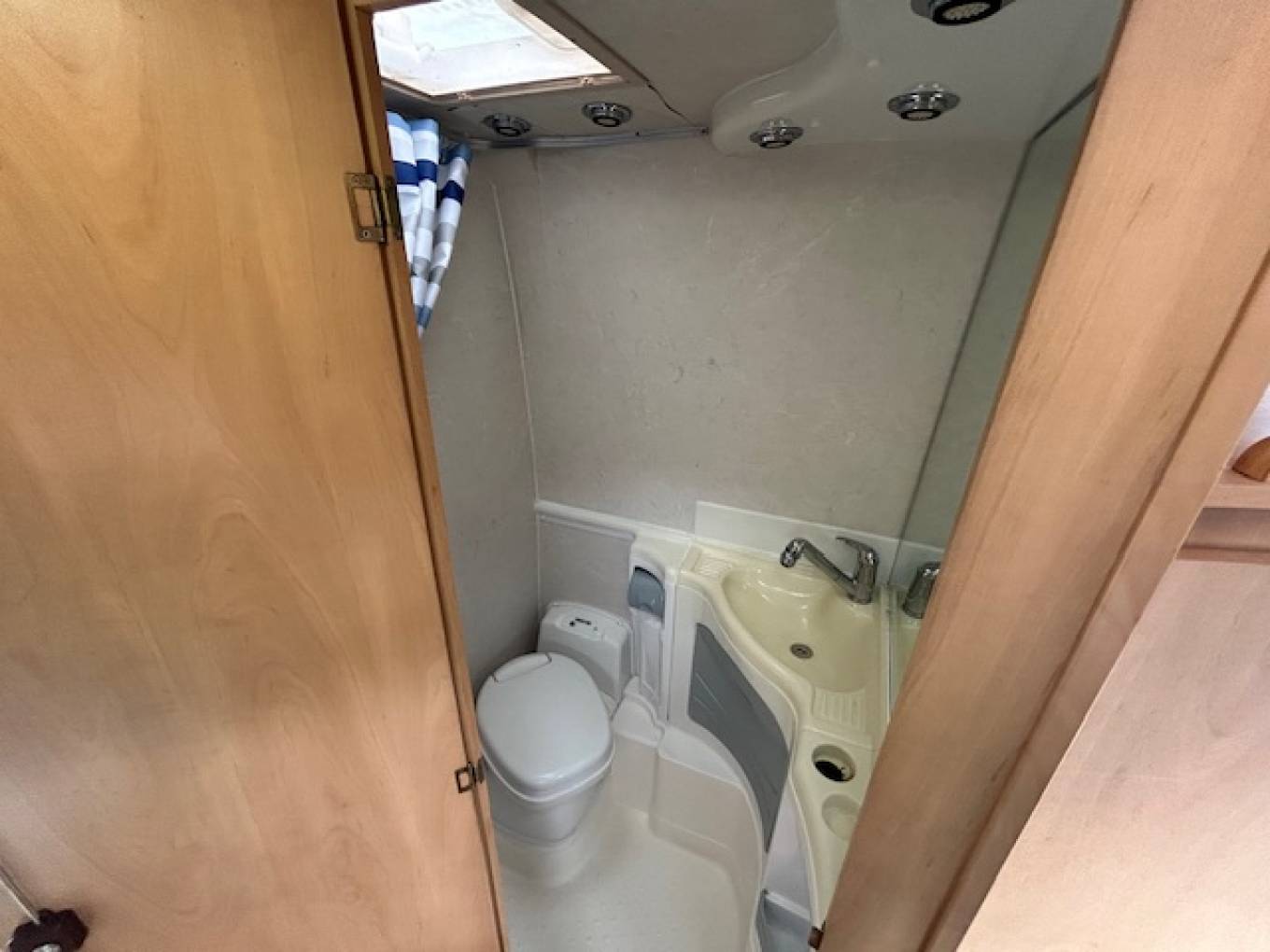 Adjacent the kitchen is the washroom which contains a shower with curtain, a swivel bowl cassette toilet, a sink with storage underneath and a mirror.