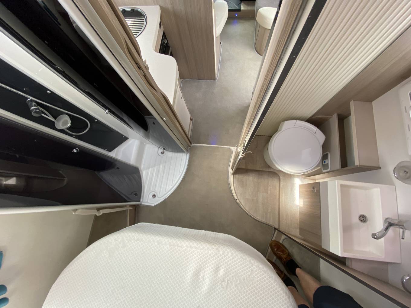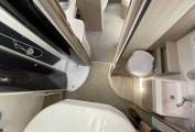 The mid washroom has a vanity washbasin with mixer tap, a Thetford cassette swivel toilet, medicine cabinet, mirror, side window. Across the hallway is the separate shower cubicle with bi-fold door, with skylight above, the washroom door also closes across the aisle to give privacy to the rear of the motorhome.