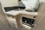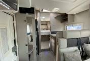 Enter through the habitation door and you have the kitchen in front of you, including circular sink with mixer tap and removable drainer, a Thetford three gas burner hob and adjacent there is a large tower fridge with separate freezer box above. Storage cabinets throughout.