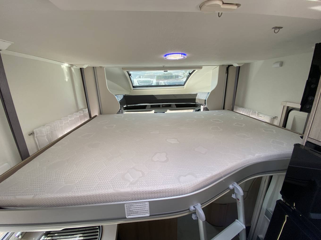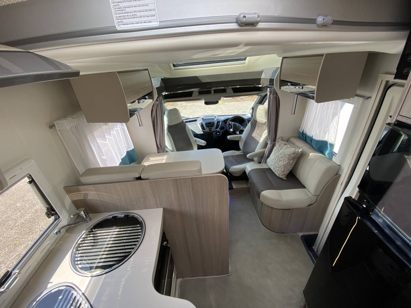 The cab includes large skylight, captains seats that swivel to face the living space, air conditioning, reversing camera monitor, USB ports, radio with Bluetooth phone connectivity, cruise control, electrically adjustable wing mirrors, leather steering wheel with audio controls, driver and passenger airbags and full concertina windscreen blinds.