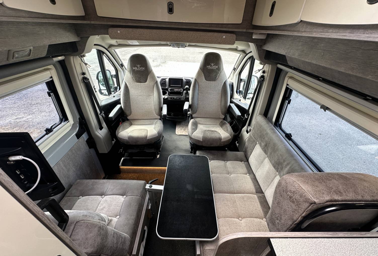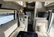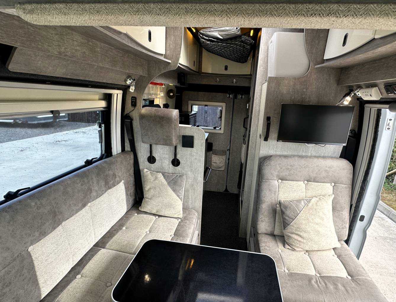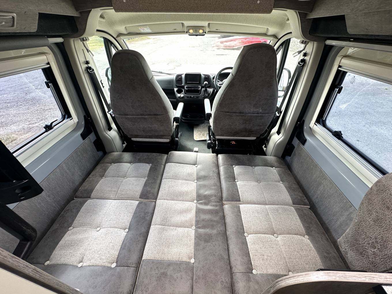 To the front, you will find the two additional travelling seats and two swivel captain seats, which provide a great dinette and easily slide to convert to a spacious double bed.