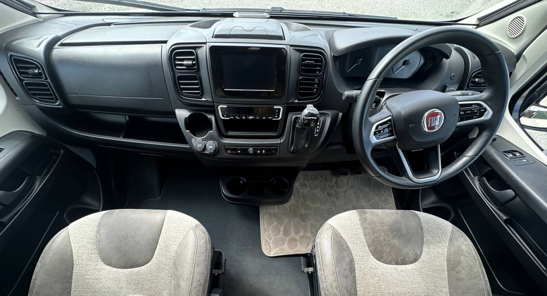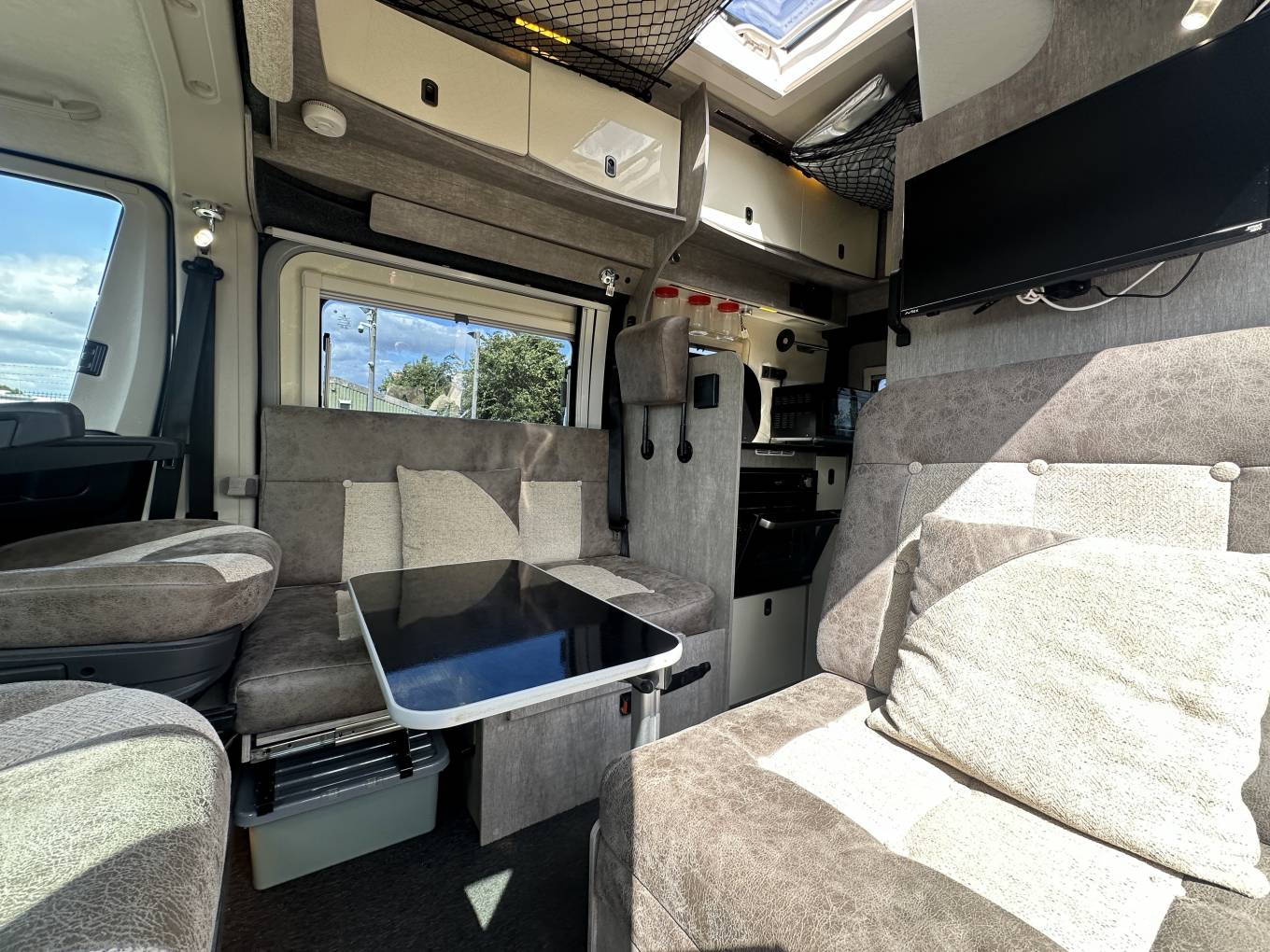 The vehicle comes with a touch-screen multimedia system, including a reversing camera, navigation system and Apple CarPlay, Bluetooth, Remis cab blinds, tailor-made front & side external window blinds, Truma hot water and heating system, TV, microwave, electric step, wind out canopy, external gas point and alloy wheels