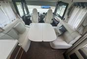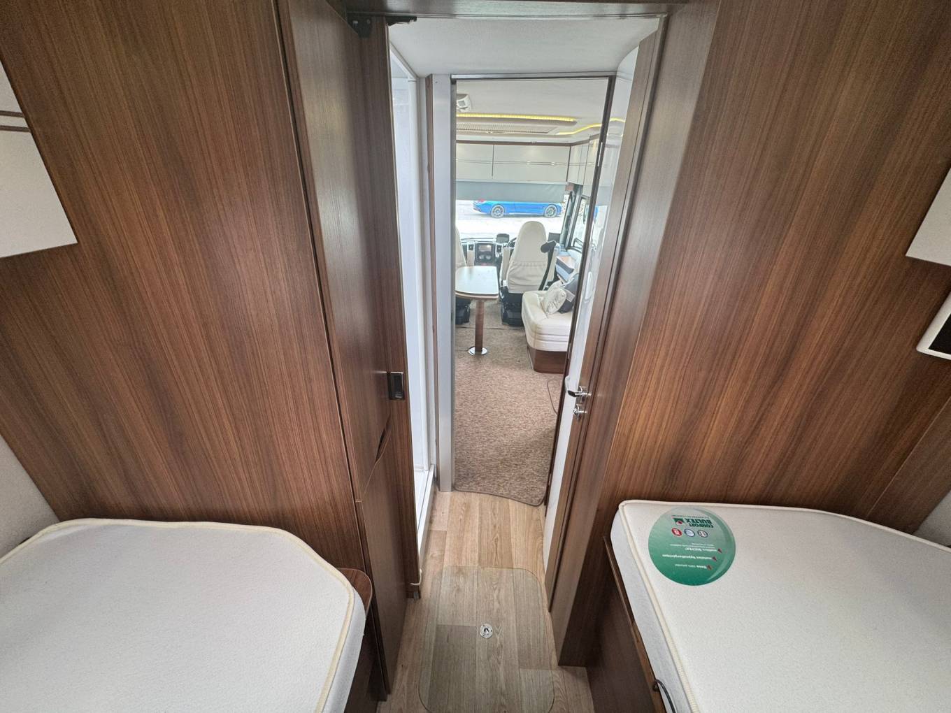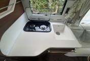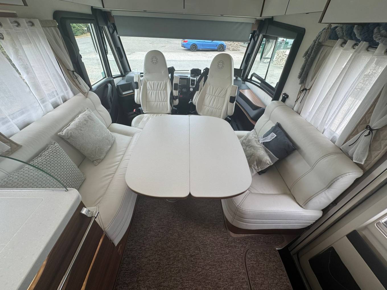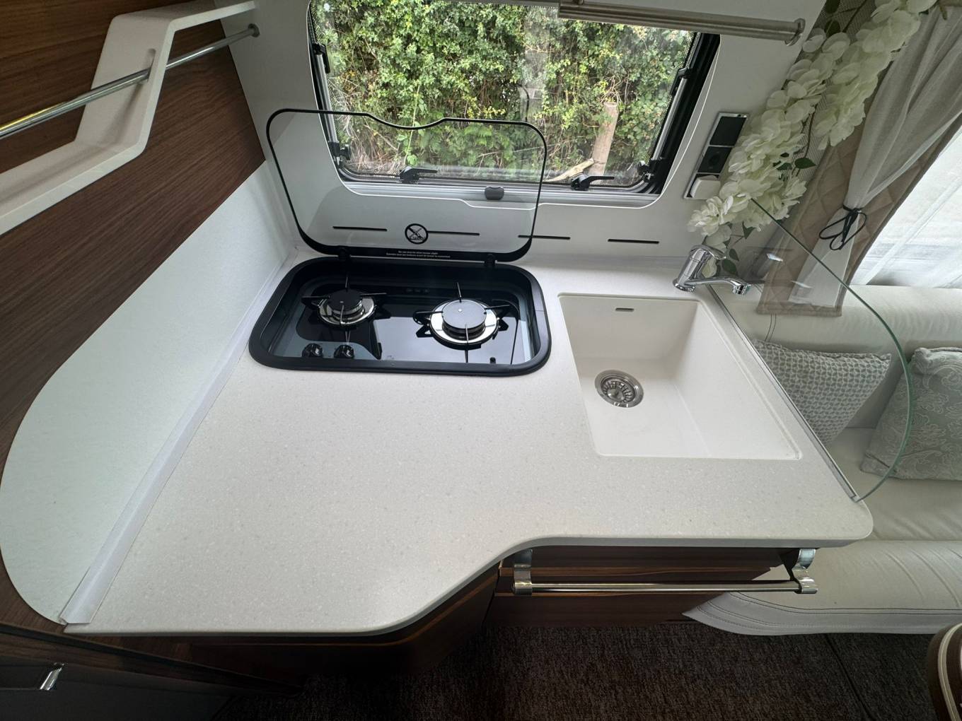 Inside, you'll be welcomed by a spacious and elegant living area, complete with sumptuous leather upholstery and swivel driver and passenger seats, perfect for relaxing or entertaining. The well-appointed kitchen comes fully equipped with a hob top, grill/oven, and a large fridge/freezer – everything you need to cook comfortably on the go.