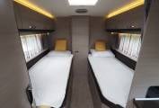 The bedroom area benefits from two fixed single beds with storage above leading tothe rear washroom. A flushing cassette toilet, sink with vanity mirror and storage and a good sized separate shower cubicle provide all you need for personal comfort when out on the open road. Externally there is a wind out sun canopy, rear bike carrier and large garage storage to both sides. The Optima Deluxe has duel fuel Truma hot water and heating with separate control panel, 230v electric hook-up and a 12v leisure battery. Two calor gas bottles are supplied.