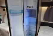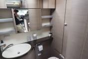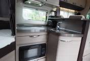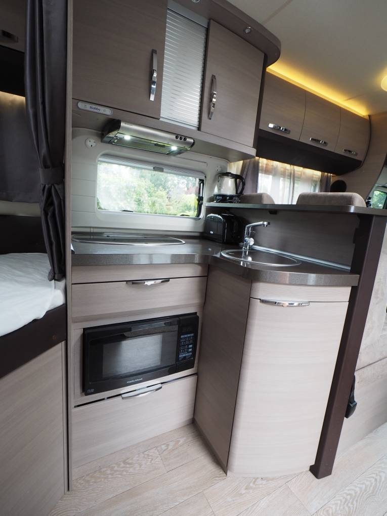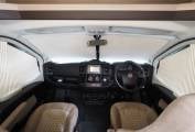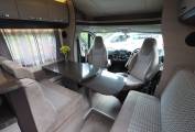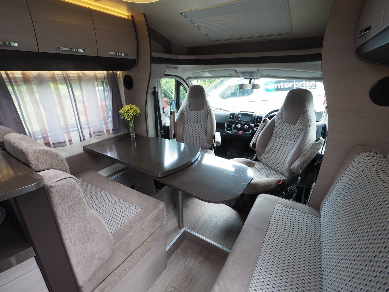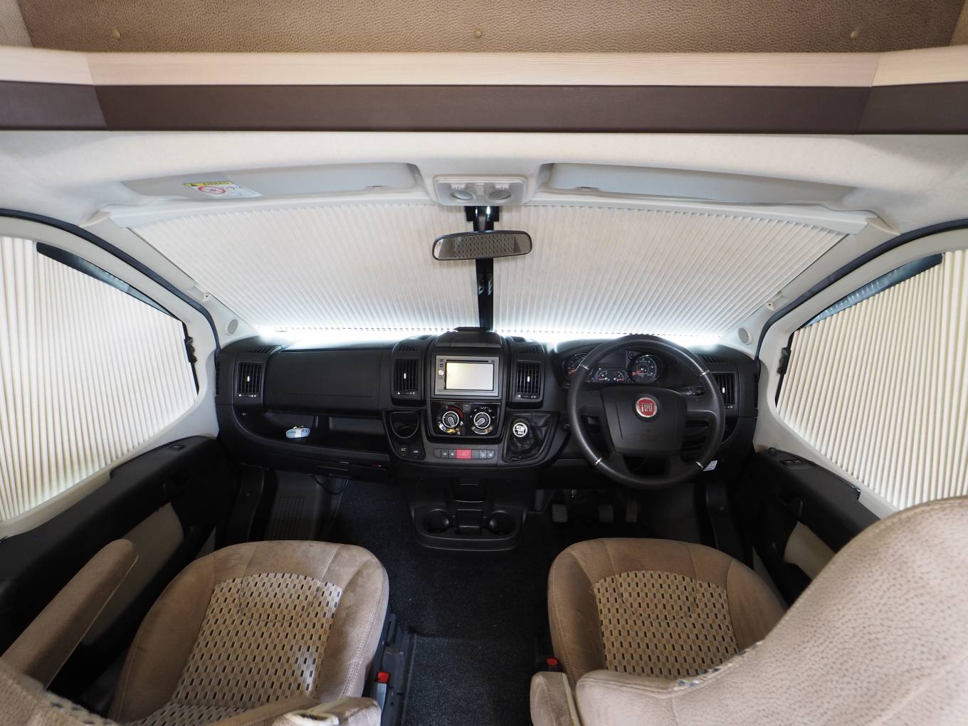 Up front the Driver and passenger comforts include cab air con, cruise control and limiter, entertainment system with built in Sat Nav and rear reversing camera screen. The cab is fitted with Remi Concertina Blinds for privacy. A spacious lounge with side sofas is complimented by an extendable table and the added bonus of the driver and passenger captains chairs swivelling to provide further comfortable seating options. The kitchen offers a three burner gas hob, sink with mixer tap, combi microwave, oven and grill and a large fridge freezer.