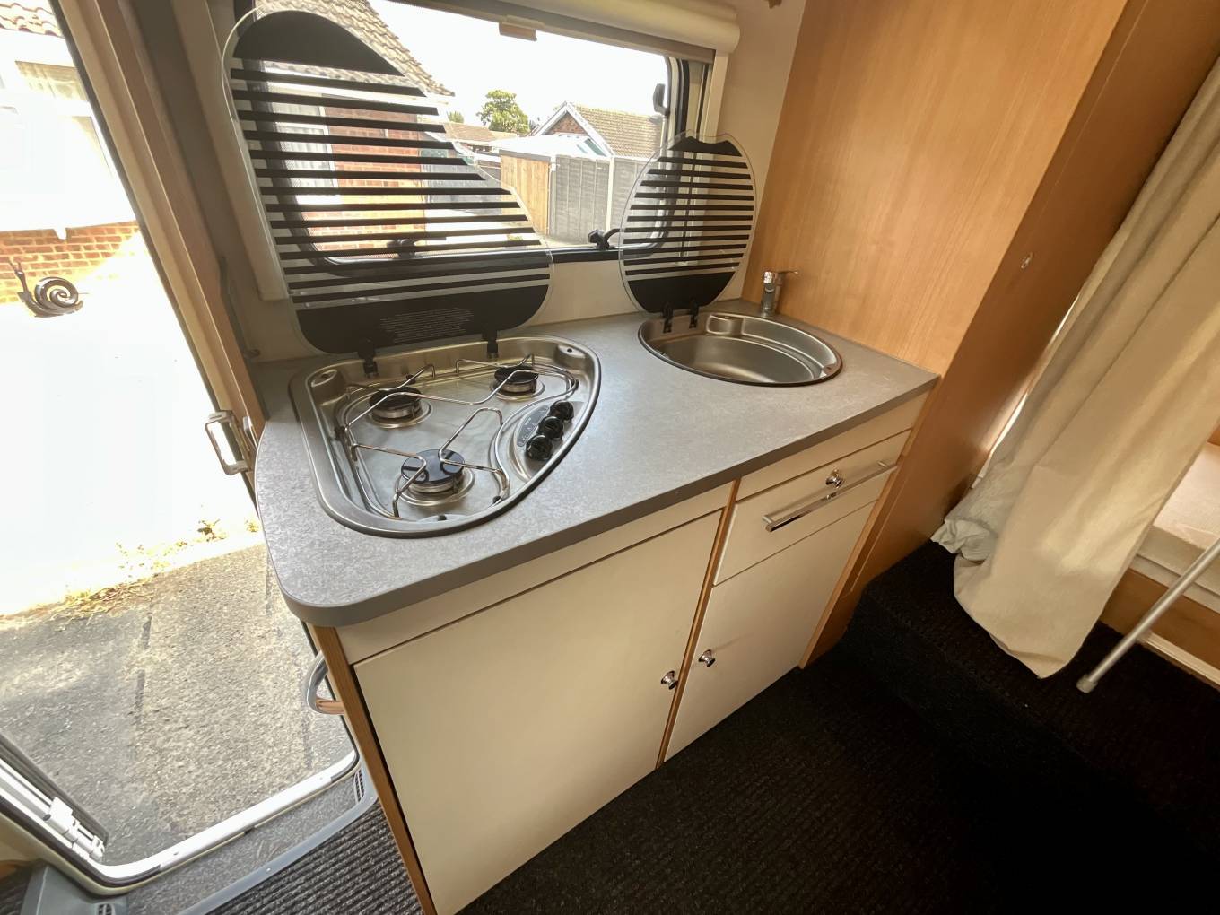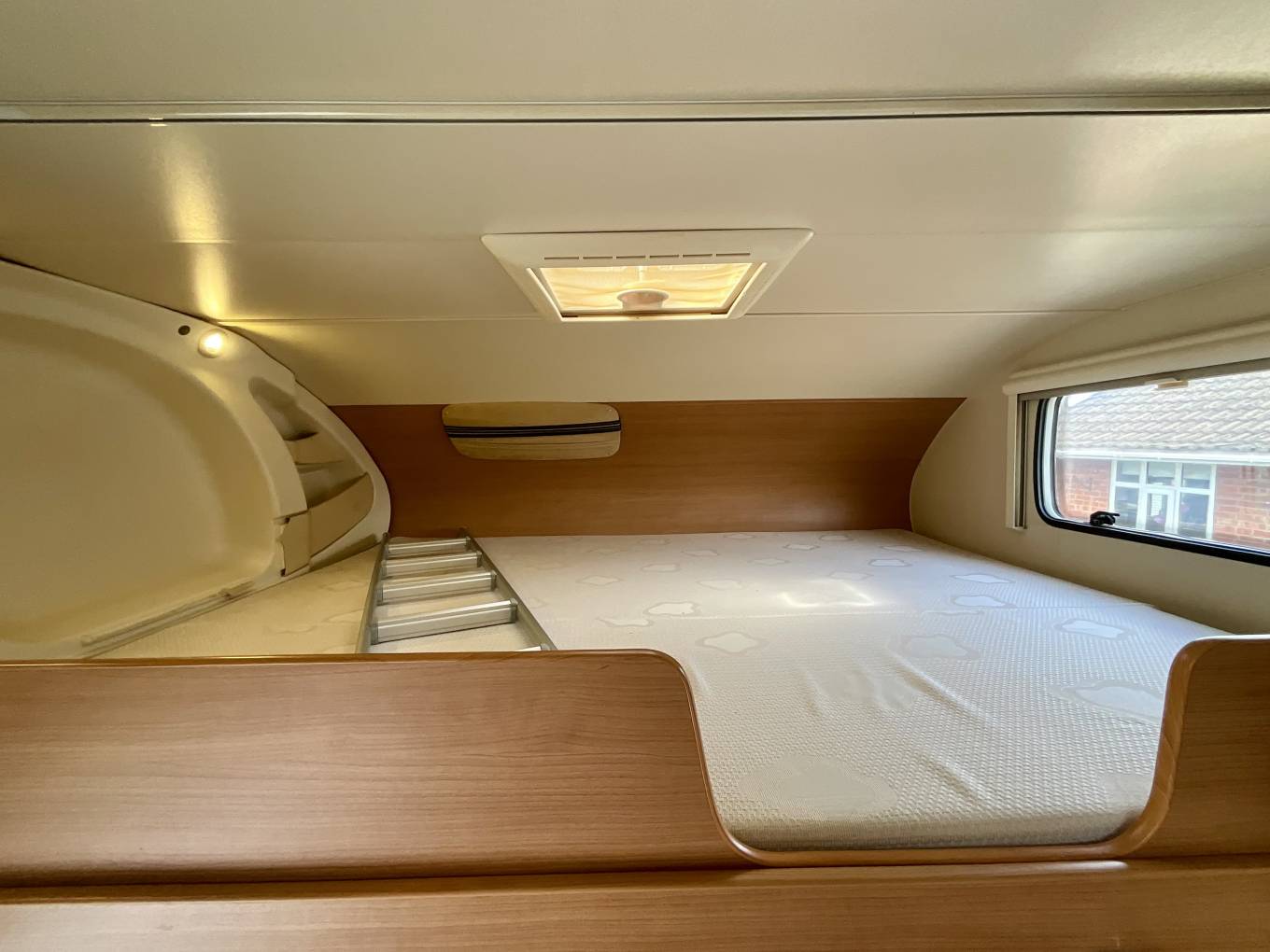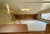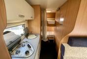 The 6 berth comprises of a spacious overcab bed, a double dinette area that can be adapted to make another double, and two rear bunk singles. The lowest bunk can be folded out of the way to allow garage room for storage for anything you might need on your travels.
