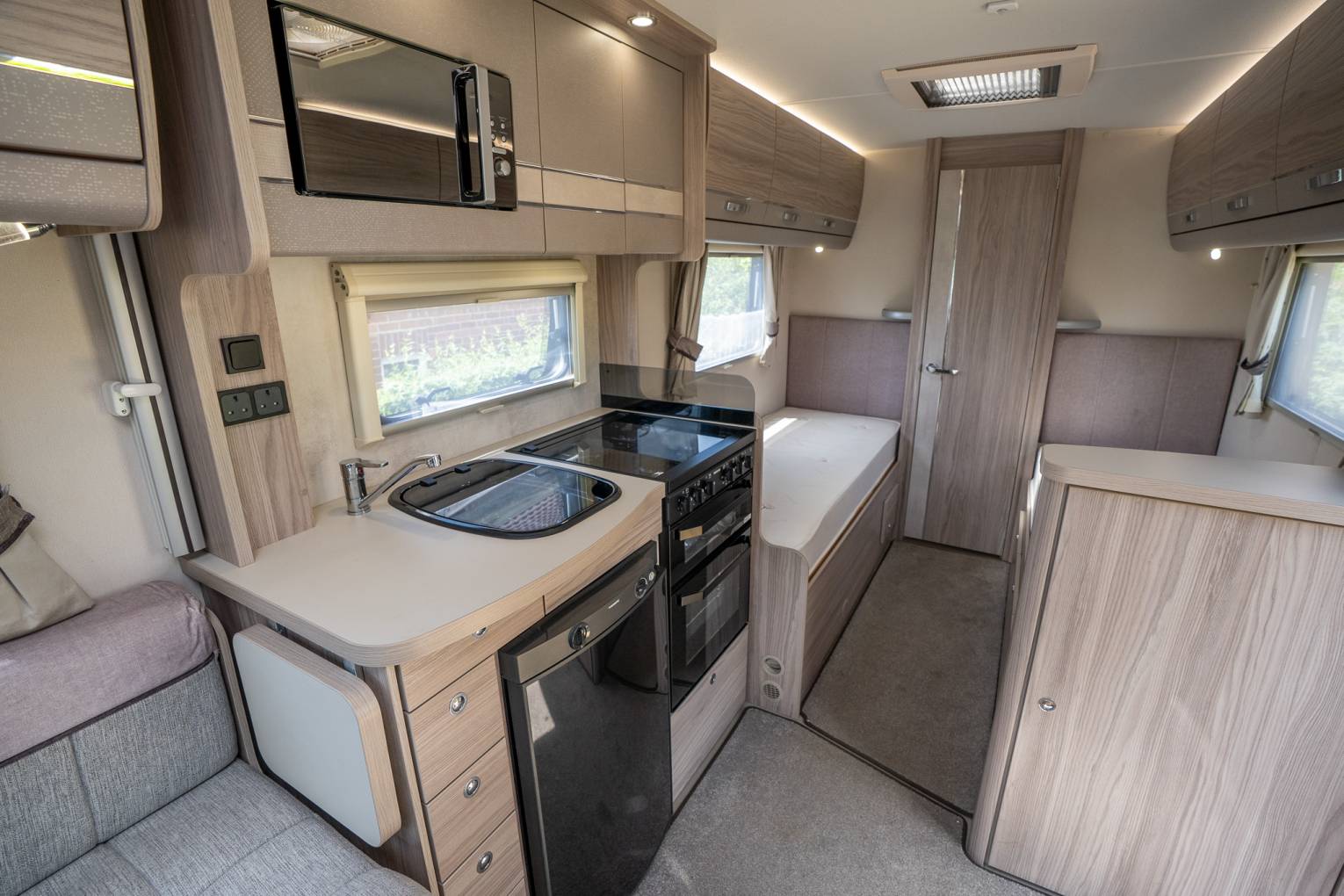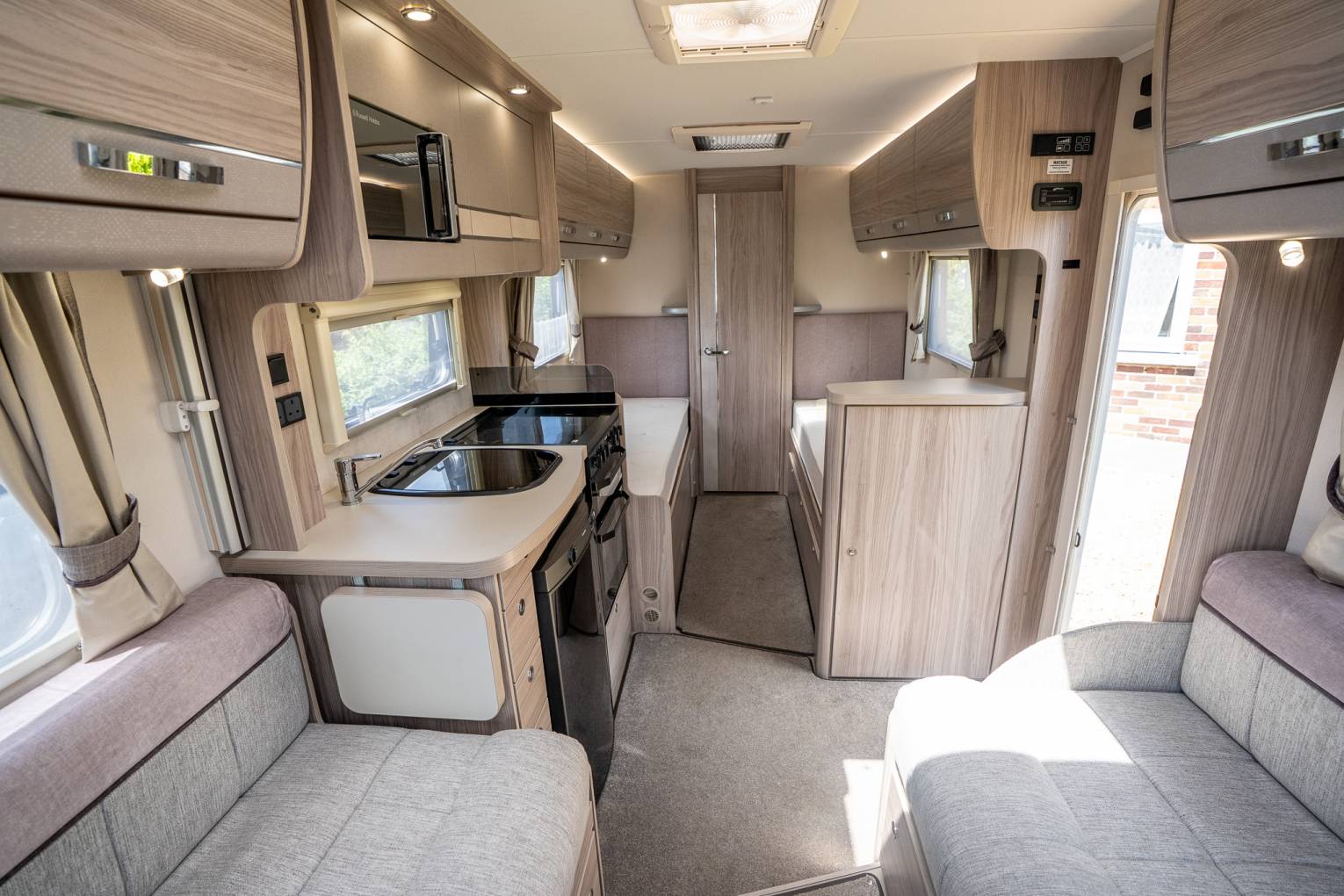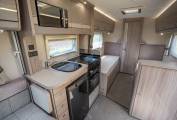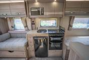 For comfortable and luxurious living - little can match the Elddis Prestige 185. As you enter the habitation door, you are greeted with a unique and spacious living accommodation which offers an open and sociable living room with two benches creating a wrap-around lounge. These benches open up to offer two belted seats to ensure that every berth has a belt and nobody is left out of your adventures. The kitchen in the centre of the habitation area comes with plenty of worktop space, a large Fridge freezer, a built-in Russell Hobbs Microwave and a spacious unused Thetford Oven and Grill so you can cook even the finest meals whilst you are out on the road.
