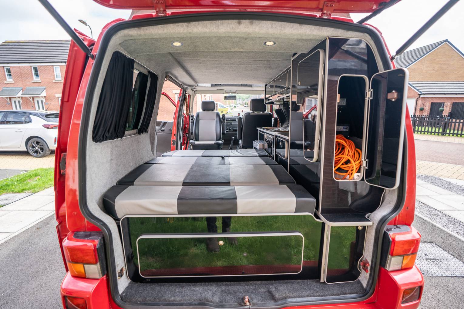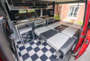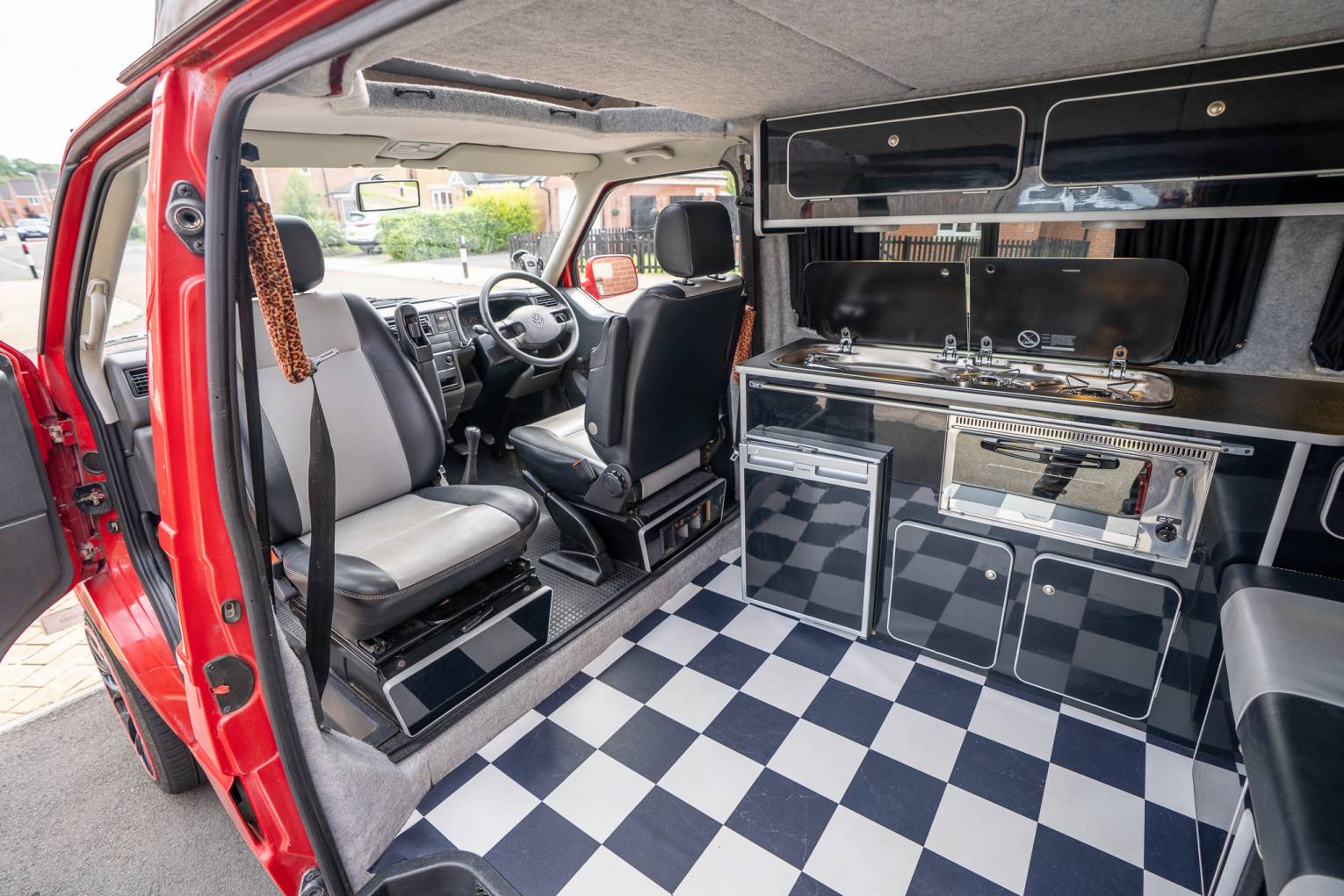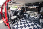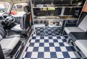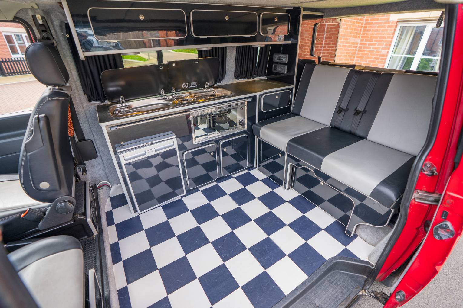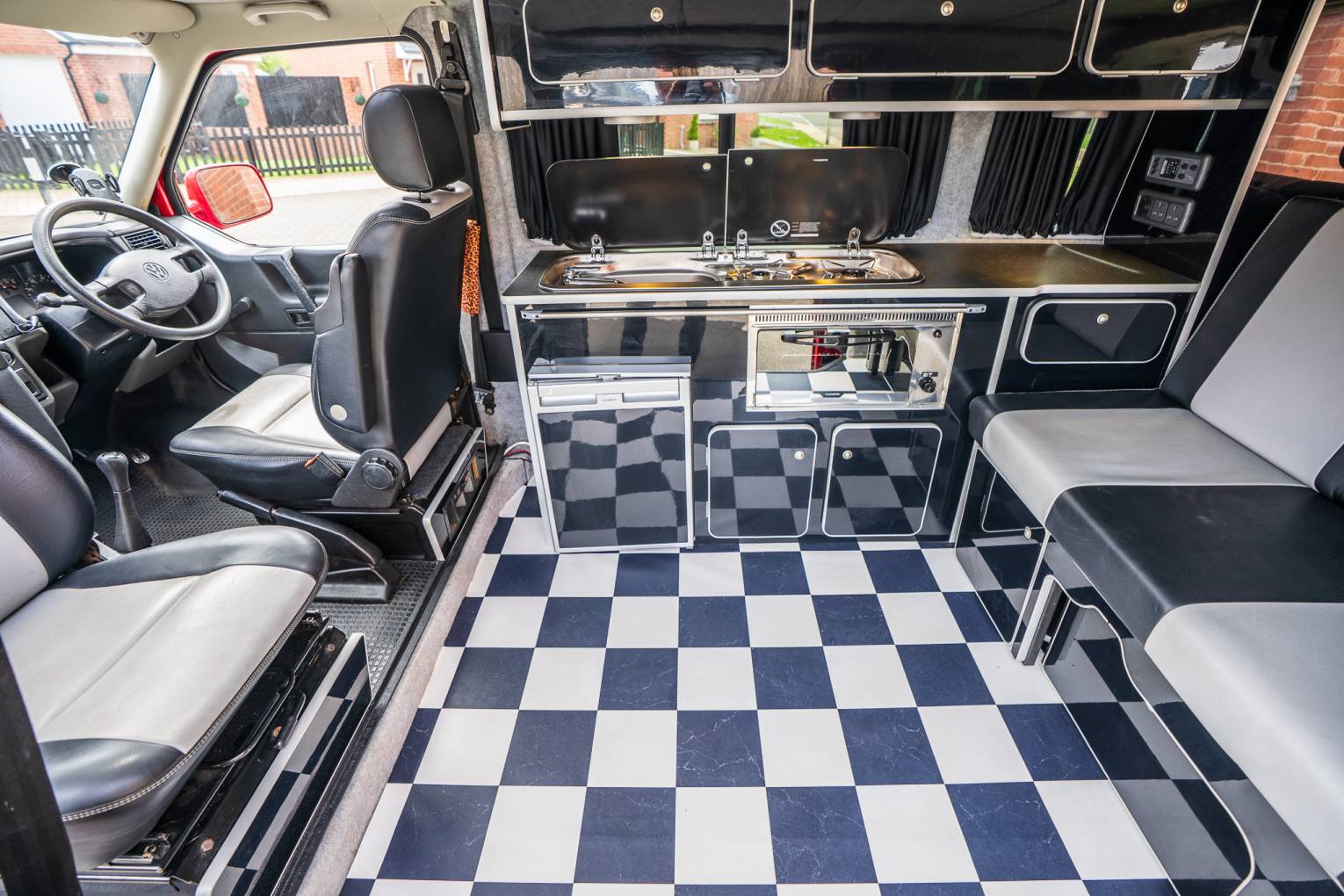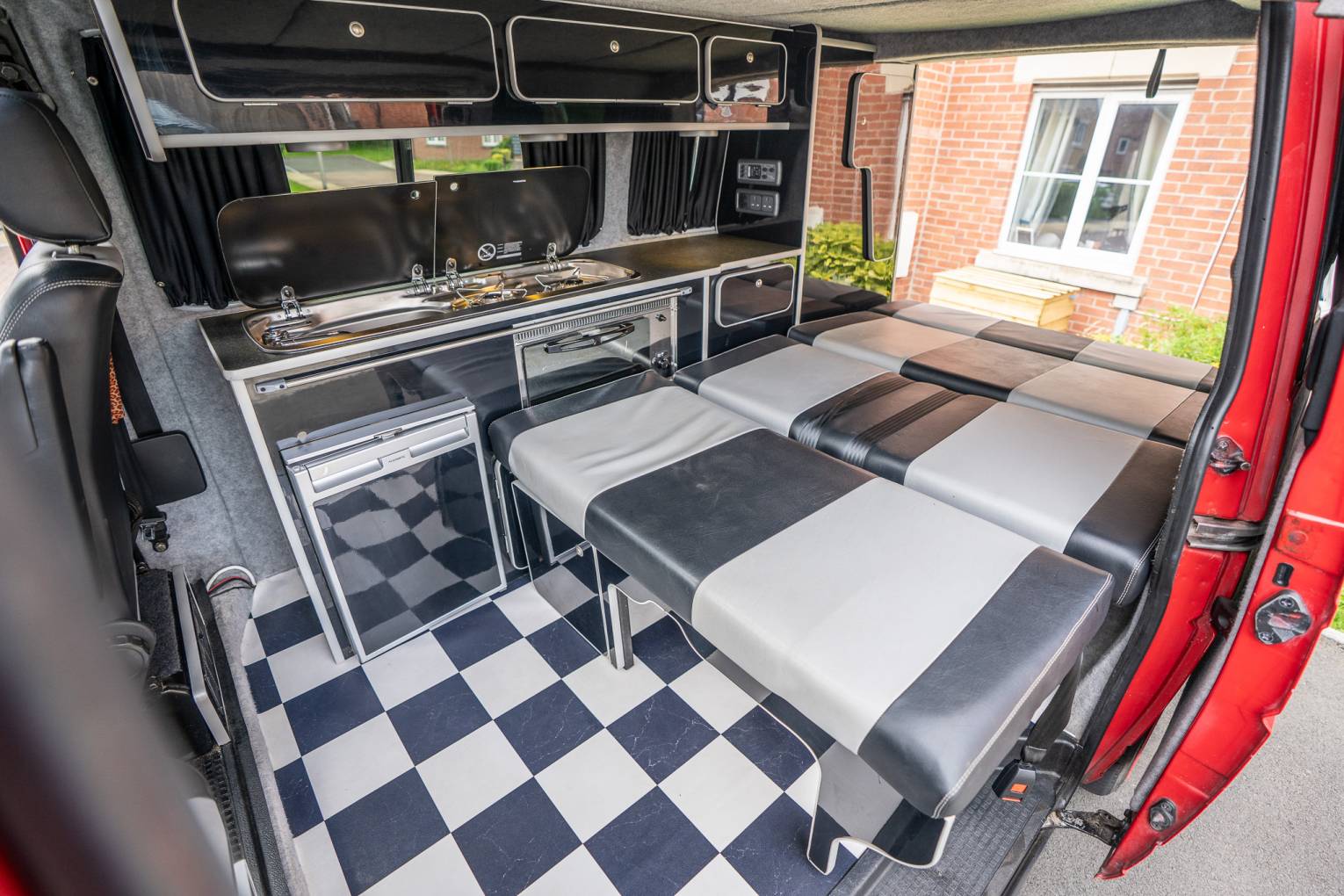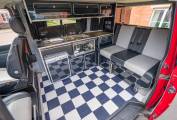 In the Kitchen Area you have a fully integrated Grill to expand your cooking capabilities whilst on the road. Just to the left - the Driver seat has an integrated PH 700 heater which is positioned to give the best possible flow of hot air through the habitation area. There are premium curtains fitted throughout and stunning two tone seat covers to compliment the classic checkerboard flooring and gloss finished cabinets. On the outside to make sure you are ready for your off-grid adventures there is a solar panel and Wolf Race Black Alloys - perfectly combining style and functionality on the road and demonstrating why so many customers love this tried and tested layout from CamperKing. The retro shape of the VW T4 and modern fixtures add to the overall feel of this vehicle and give it a unique sense of old school character mixed with modern workmanship and fittings - Making this vehicle a unique gem and one that really stands out amongst the crowd.