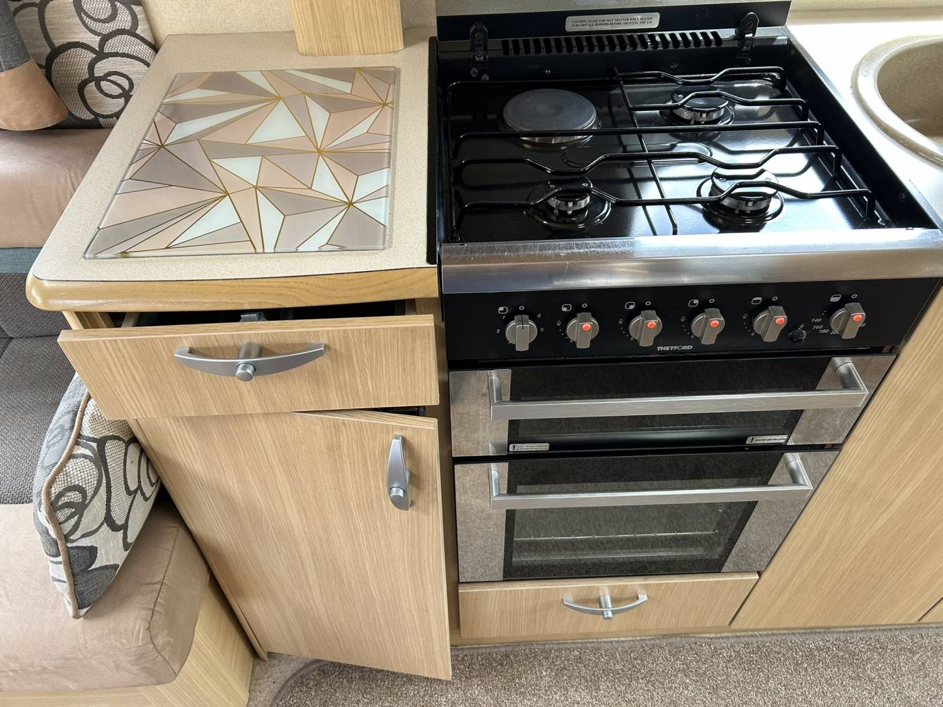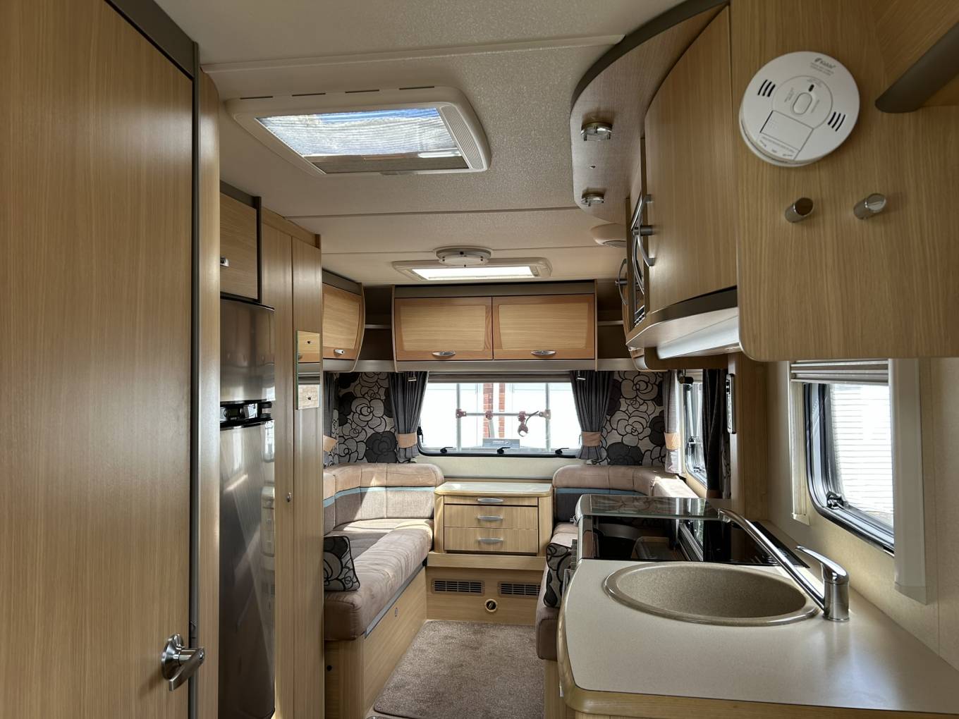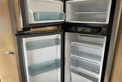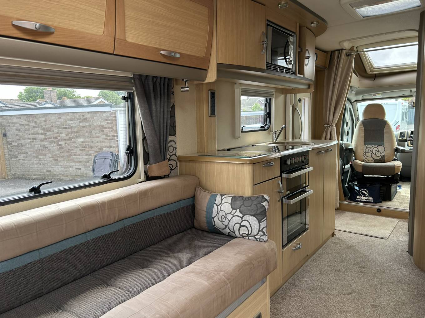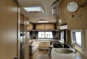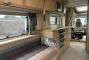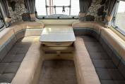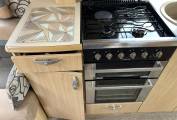 As you enter the van to your right is a well equipped kitchen featuring a large fridge with freezer compartment, 4 ring hob, microwave, oven and grill, sink with mixer tap, plenty of worktop space and lots of locker space for all your kitchen essentials.