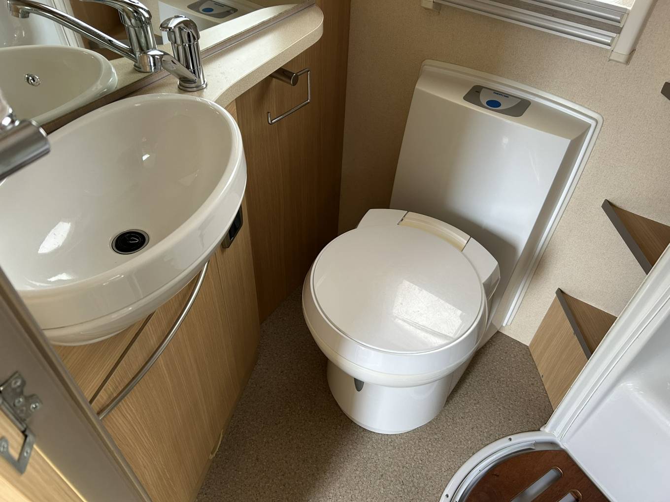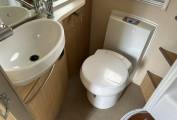 On the left of the van is a spacious washroom comprising of large shower, hand basin with vanity unit, cassette toilet and mirror.