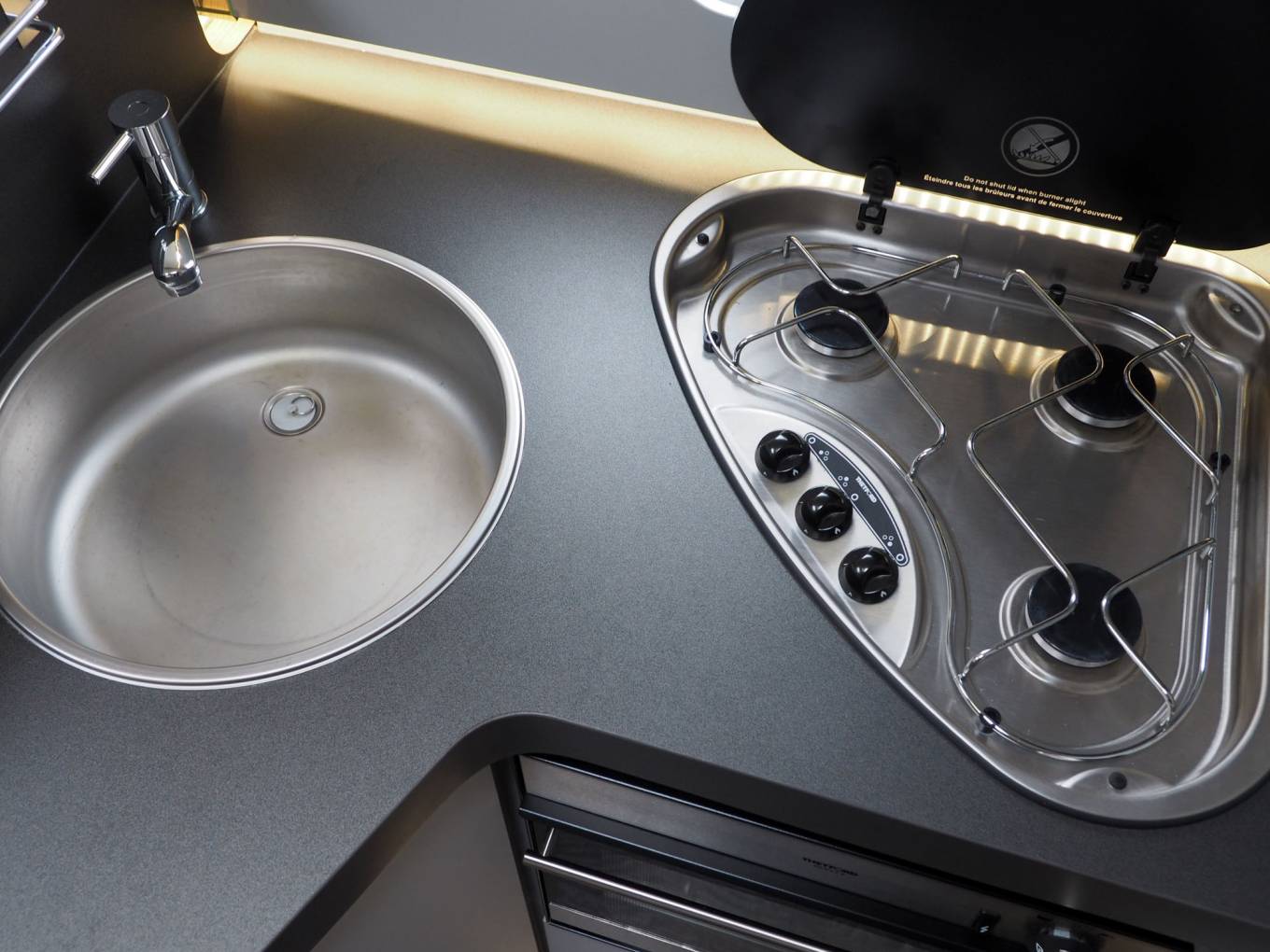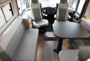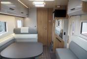 Essentially the layout comprises of a generous forward lounge, very comfortable swivel cab captains chairs, centre kitchen and rear washroom. Outside, there is a low storage compartment ideal for chocks and cables, plus a tall ski locker with adjustable shelving and internal access.The large overcab bed drops easily into position and there are integrated night blinds around the cab for quick privacy screening. The pedastal table is multipositional and can be lowered to make an occasional bed in the dinette.