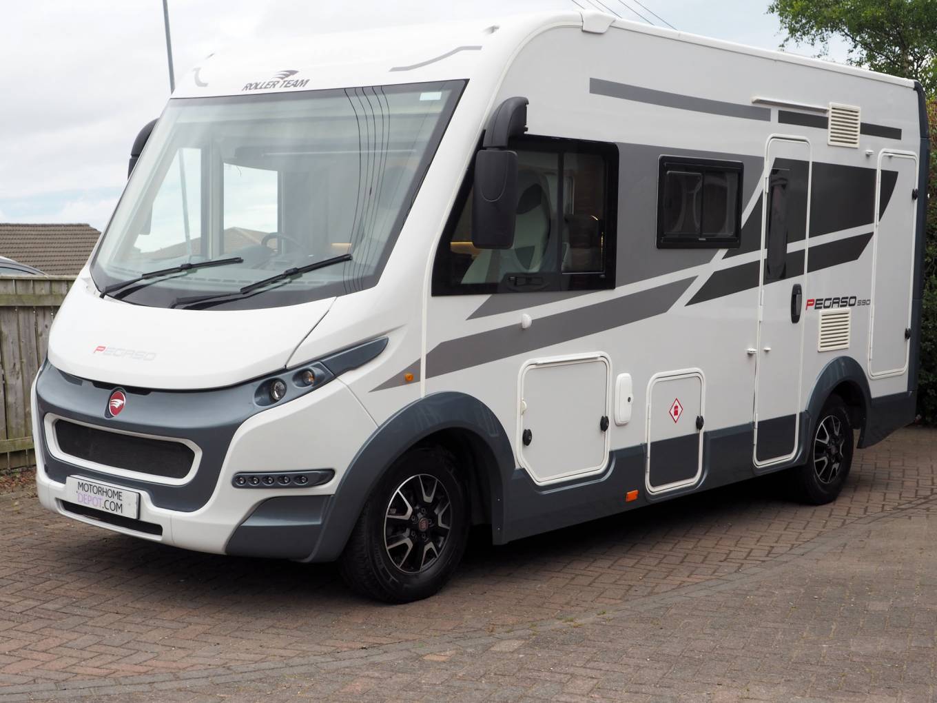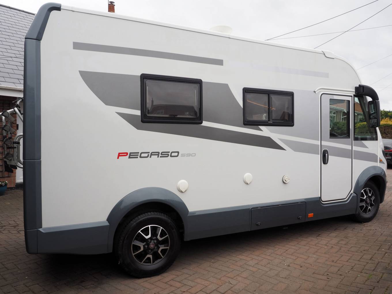 Superb compact A Class with fully automatic gearbox, modern styling, roomy interior, excellent equipment levels and well planned, versatile storage. No wonder the 590 Pegaso is a popular model for adventurers looking for a luxury motorhome with a 6 metre footprint. Plated at 3500KGs, it can be driven on a standard car licence and driving is easy thanks to an excellent view, large teardrop mirrors and reversing camera. Additional specification over standard includes 4 bike rack, Gaslow refillable LPG bottles, twin habitation batteries, aftermarket tracking system.